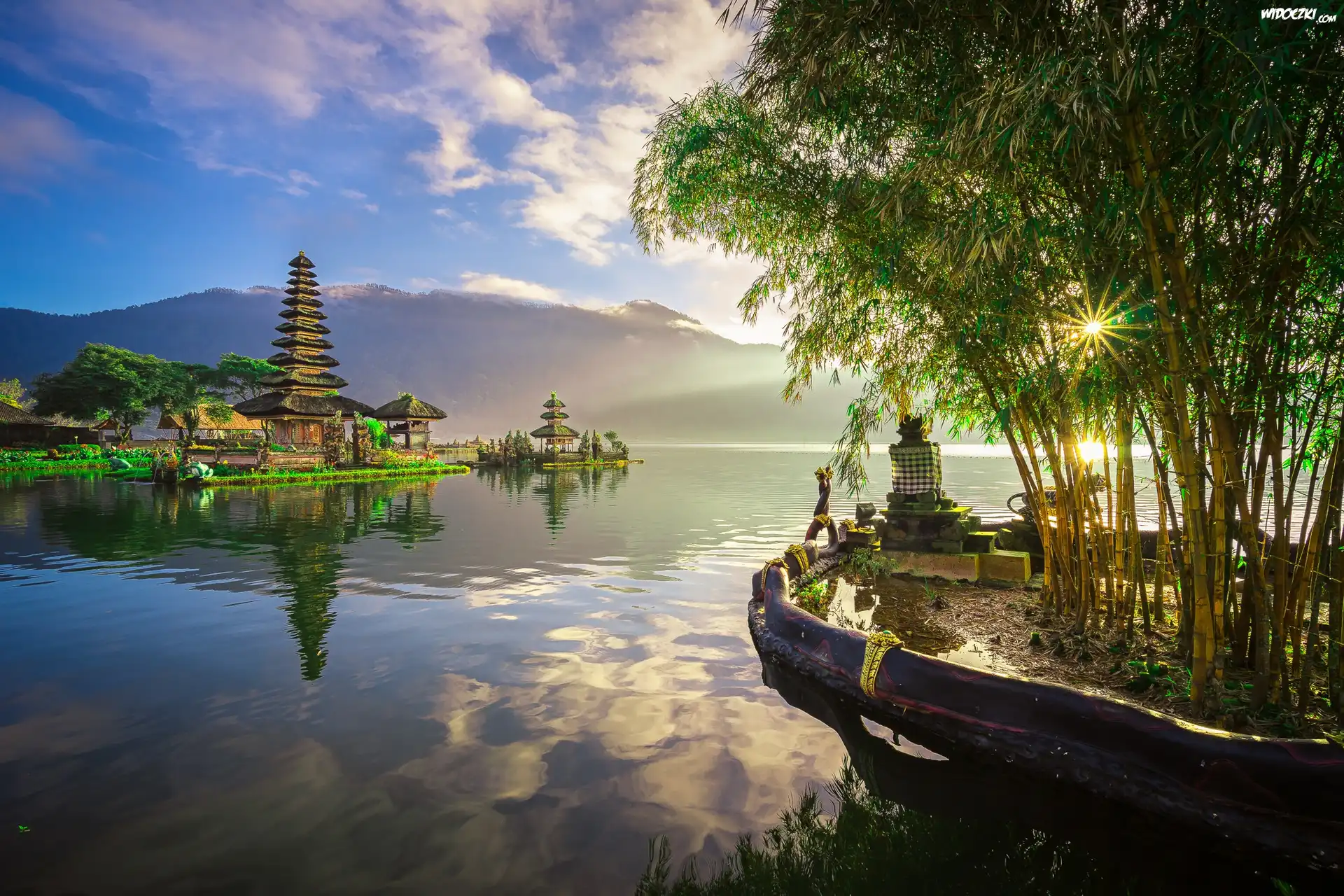 Świątynia Pura Ulun Danu Bratan, Jezioro Bratan, Wyspa Bali, Indonezja, Góry, Kwiaty, Kanna, Drzewa, Wschód słońca |
