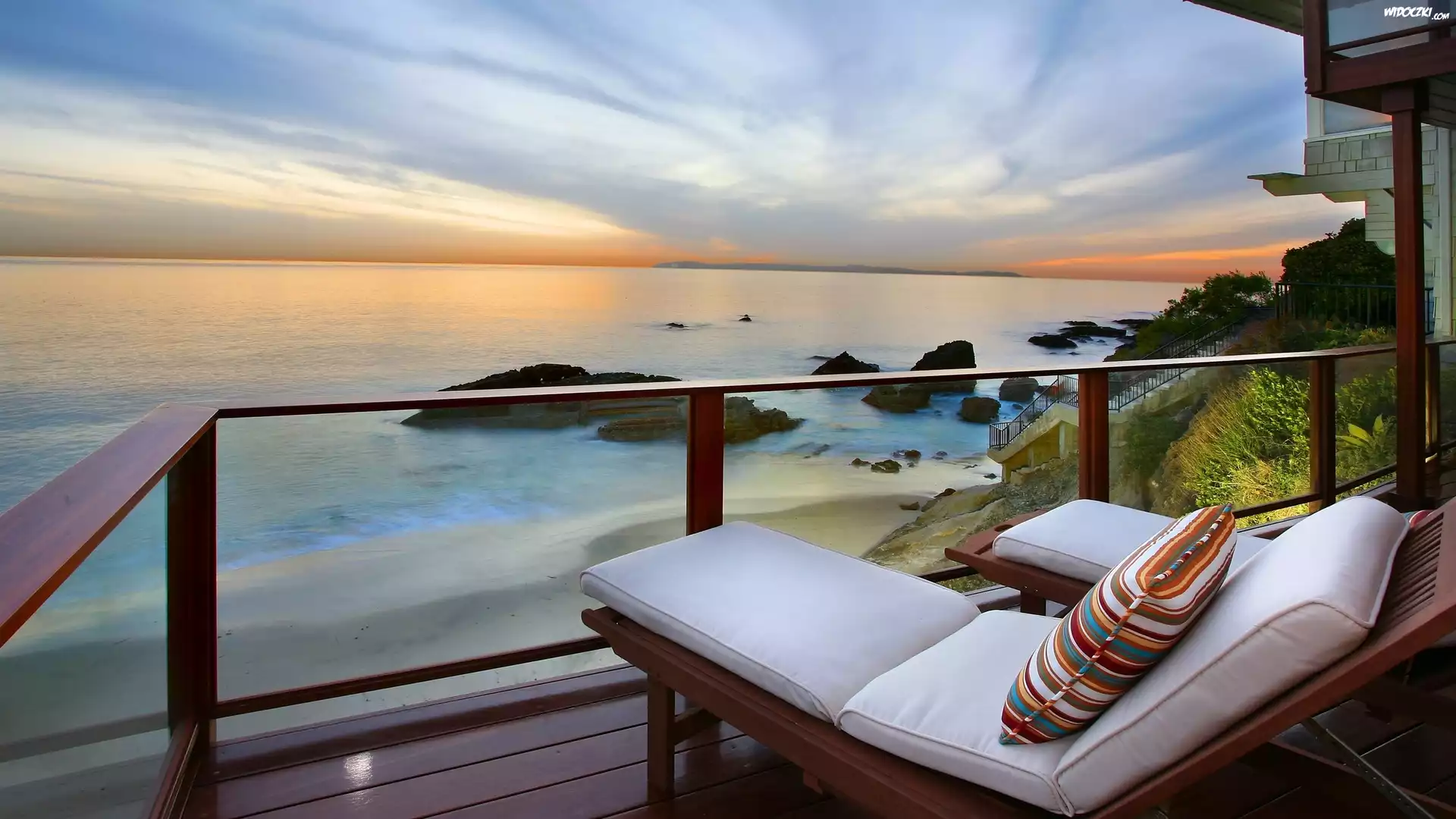 Hotel, Balkon, Leżaki, Morze, Kamienie, Zachód słońca, Wakacje