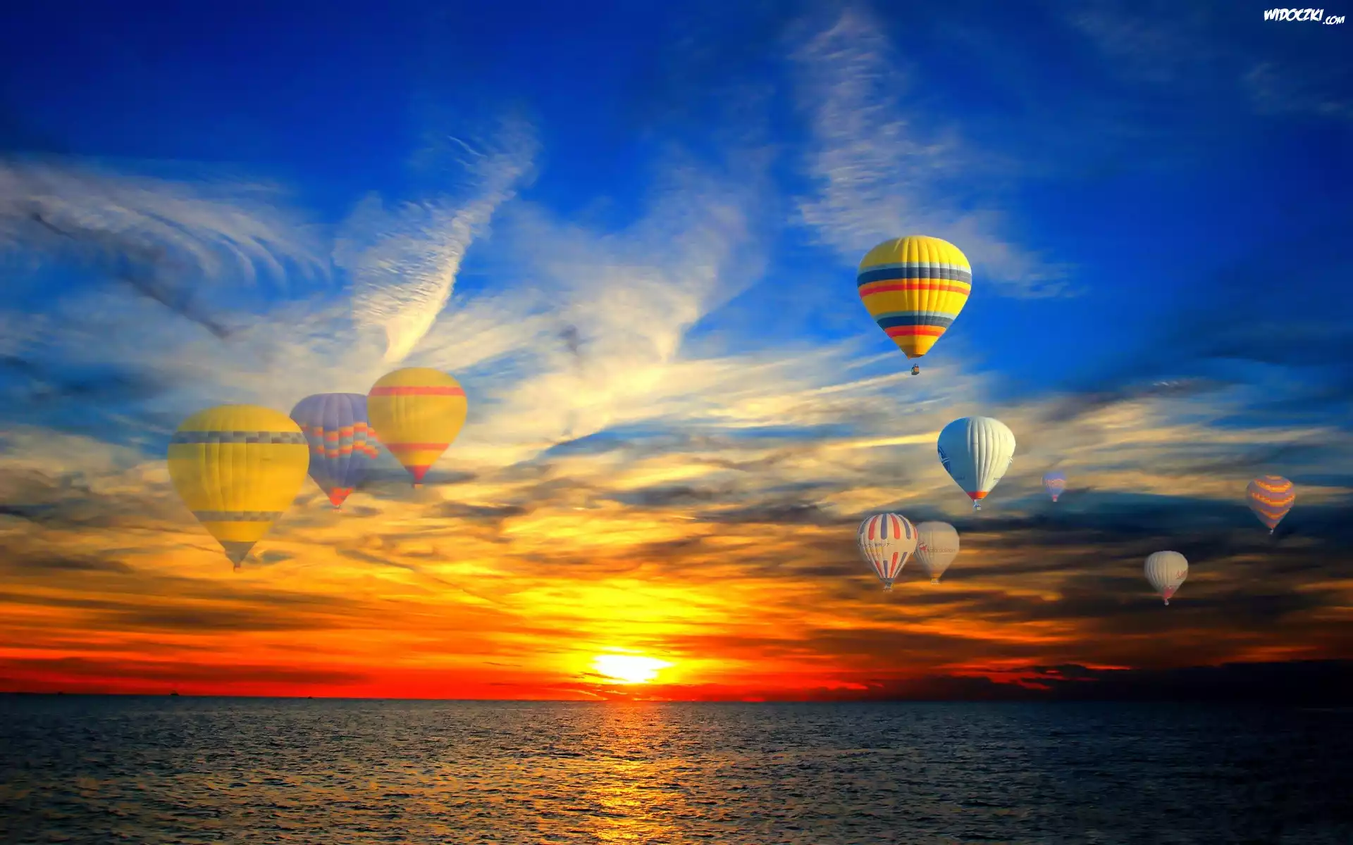 Balony, Morze, Chmury, Zachód, Słońca