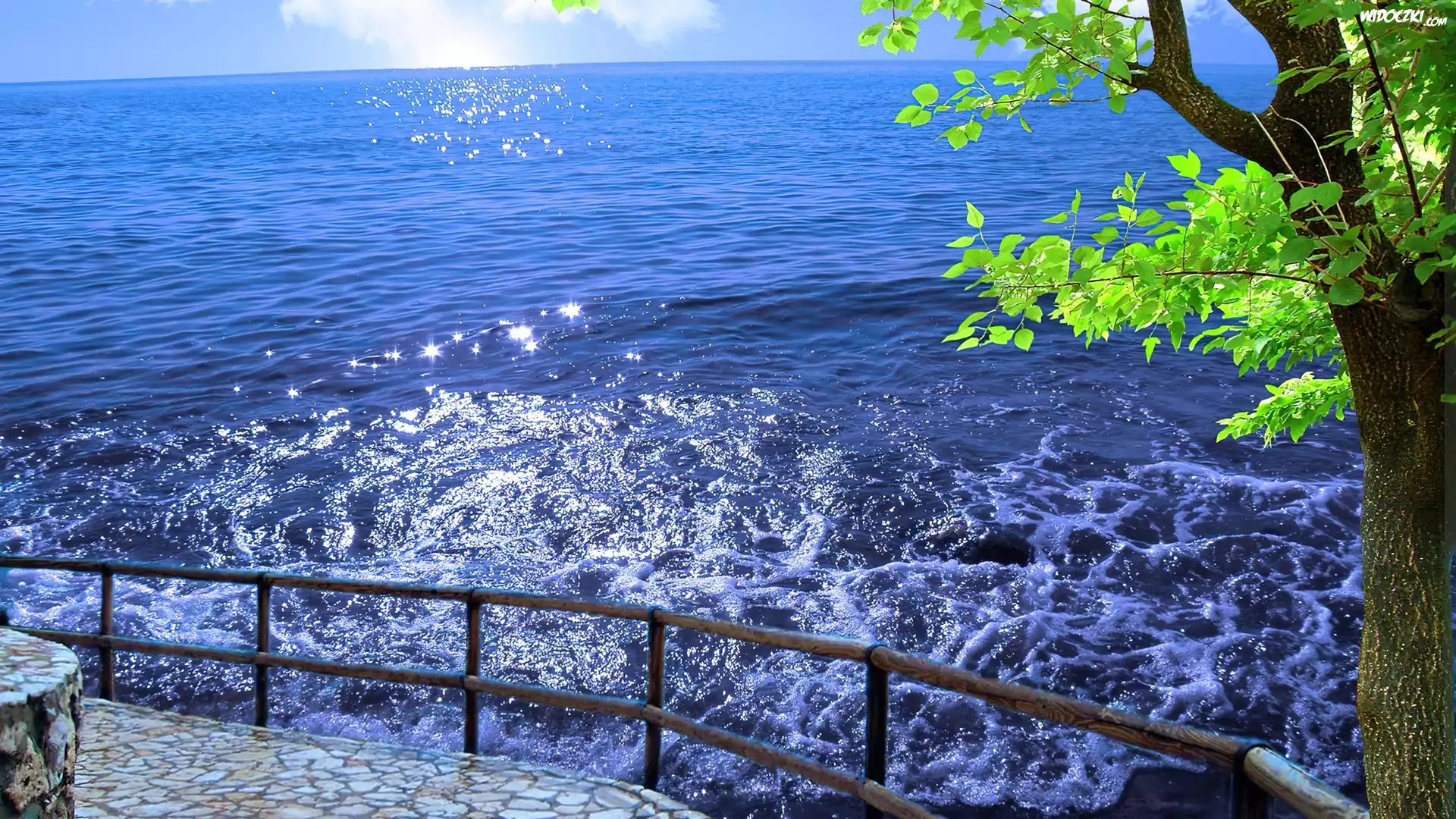 Zdjęcia, Ocean, Balustrada, Drzewo