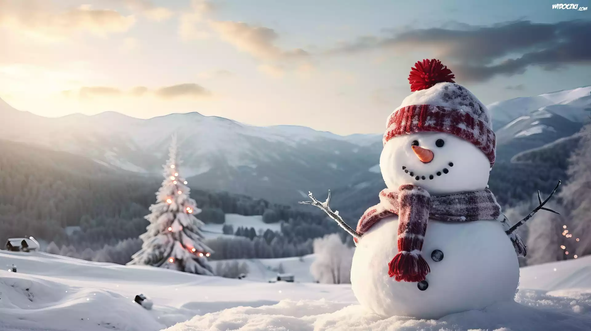 Zdjęcia, Zima, Bałwan, Choinka, Góry, Grafika