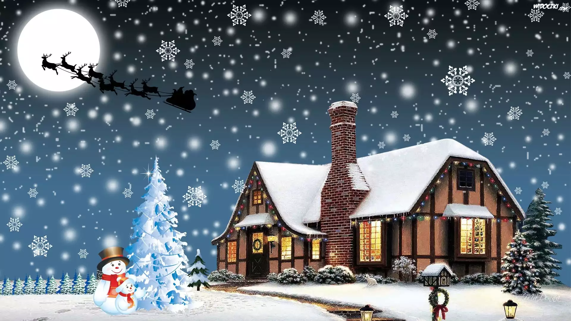 Dom, Bałwanek, Sanie, Noc, Zima, Boże, Narodzenie