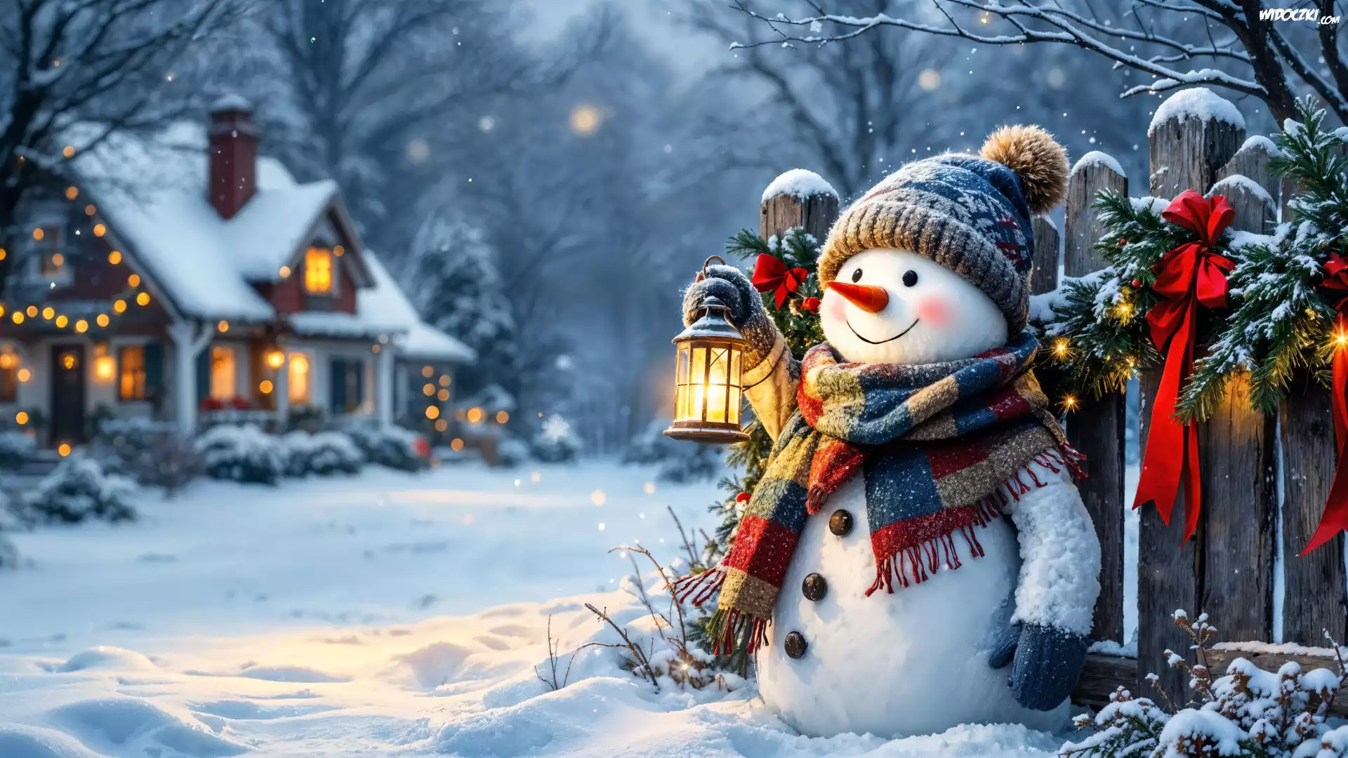 Zima, Bałwanek, Lampion, Płot, Dom