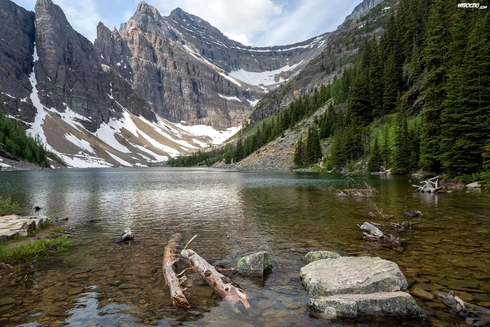 Góry, Jezioro Agnes, Park Narodowy Banff, Drzewa, Kamienie, Śnieg, Prowincja Alberta, Kanada