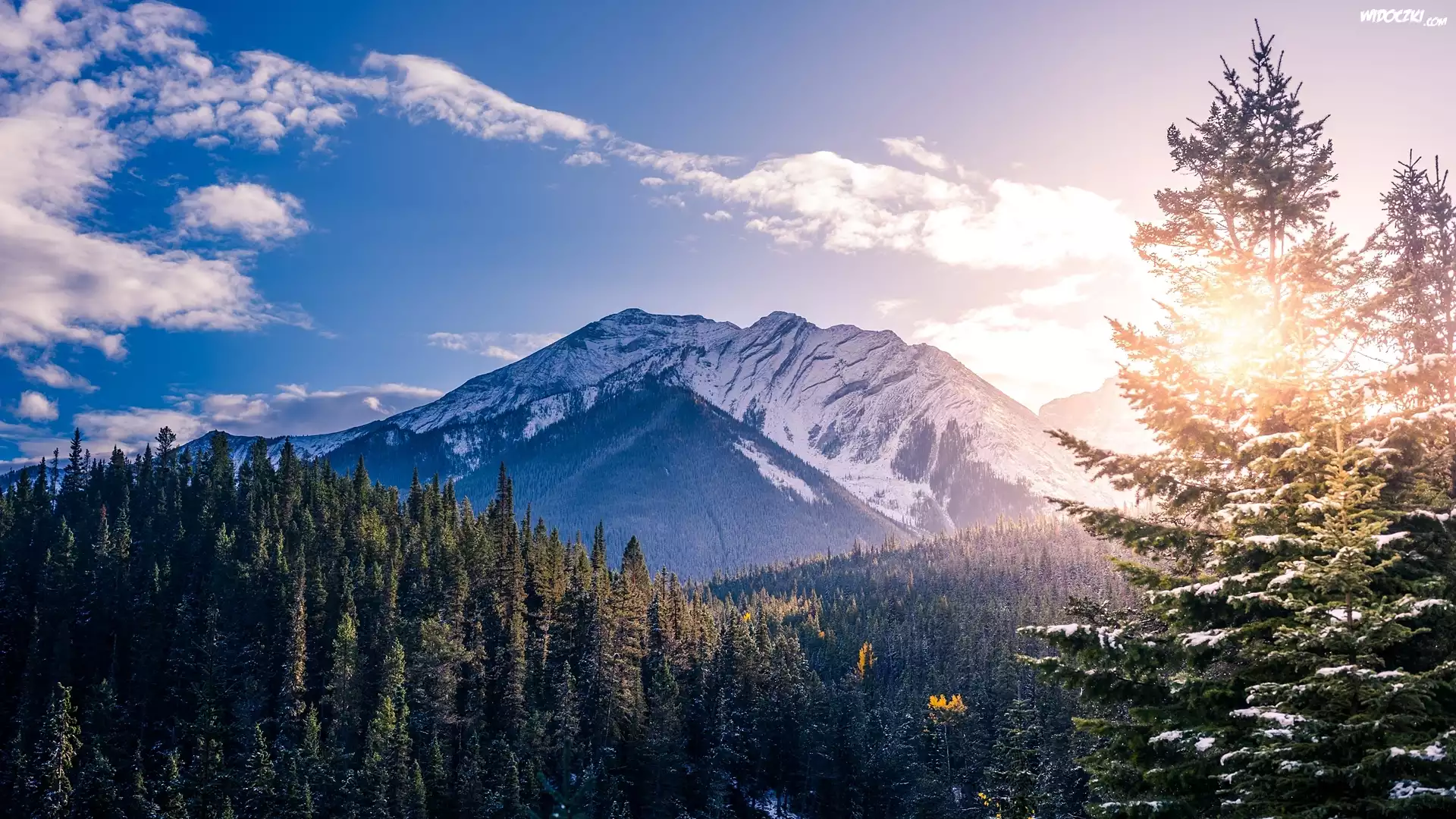 Zdjęcia, Kanada, Prowincja Alberta, Park Narodowy Banff, Góry Skaliste, Las, Drzewa, Wschód słońca