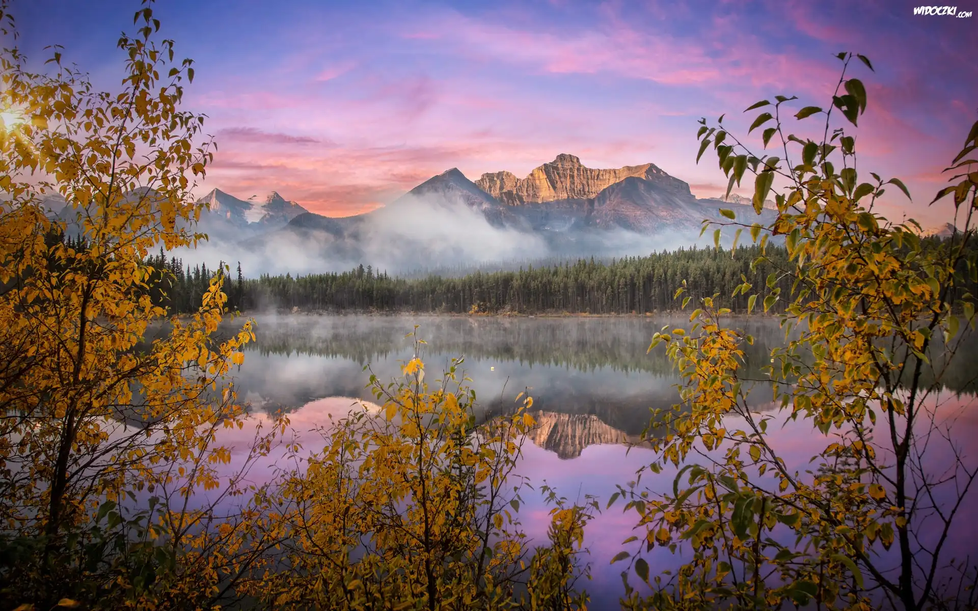 Zdjęcia, Kanada, Park Narodowy Banff, Góry, Canadian Rockies, Jezioro, Herbert Lake, Mgła, Jesień, Drzewa