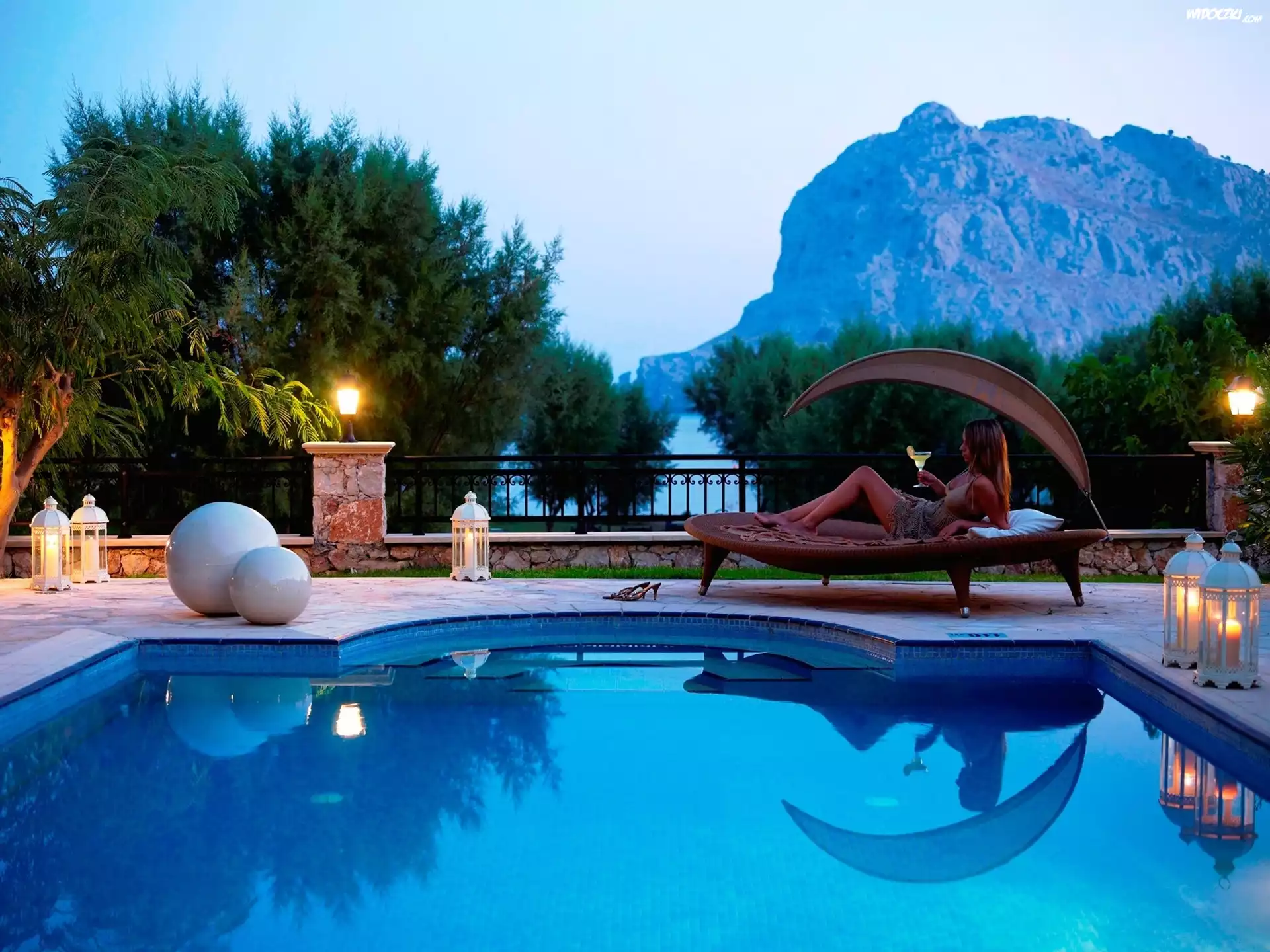 Zdjęcia, Hotel, Basen, Góry, Lampiony, Leżak, Kobieta, Wakacje