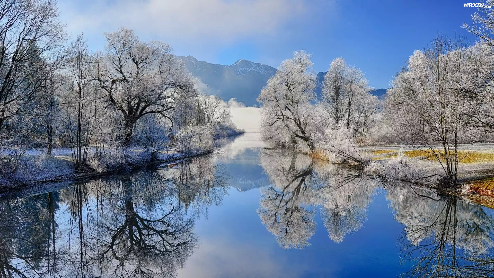 Zdjęcia, Bawaria, Zima, Rzeka Loisach, Drzewa, Odbicie