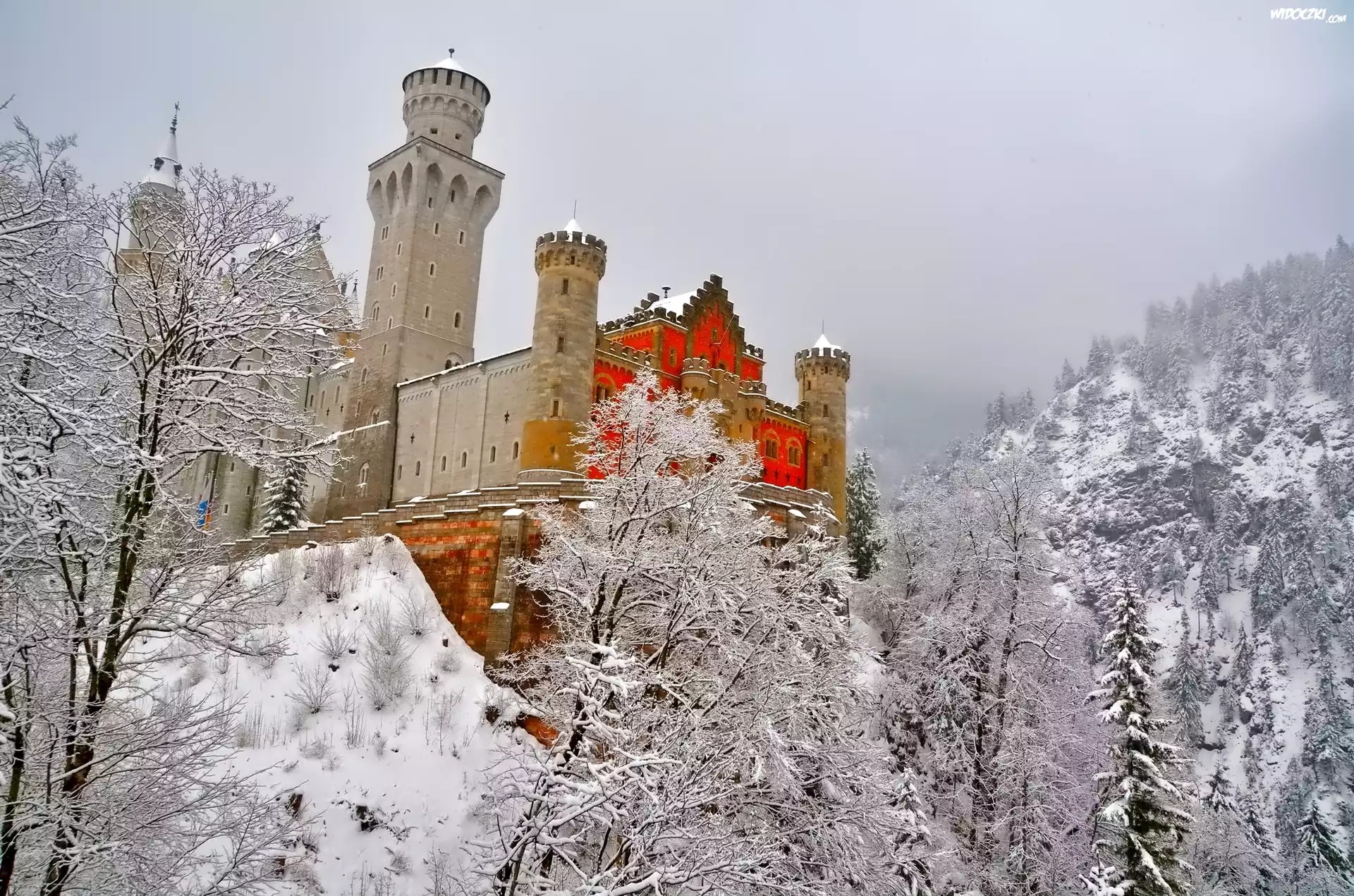 Zdjęcia, Niemcy, Bawaria, Zamek Neuschwanstein, Skały, Drzewa, Zima