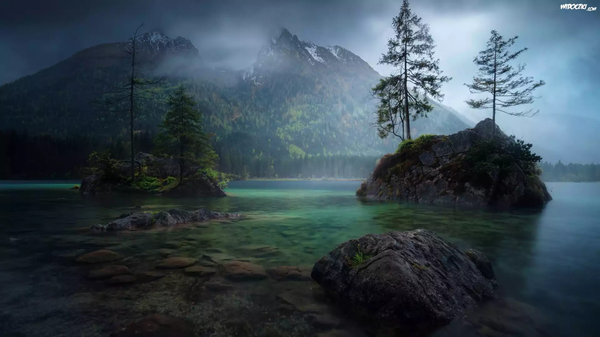 Zdjęcia, Niemcy, Bawaria, Góry Alpy, Jezioro Hintersee, Drzewa, Skały