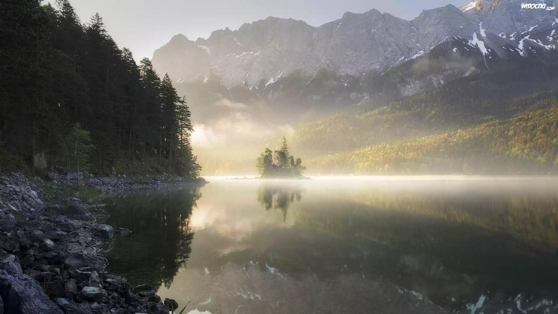Zdjęcia, Góry, Alpy Bawarskie, Jezioro Eibsee, Las, Drzewa, Mgła, Odbicie, Bawaria, Niemcy