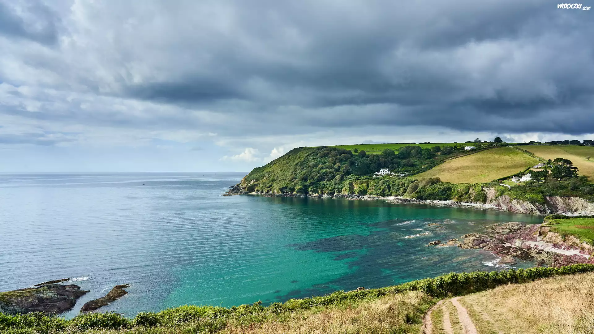Zdjęcia, Zatoka, Morze, Talland Bay, Wzgórze, Kornwalia, Anglia