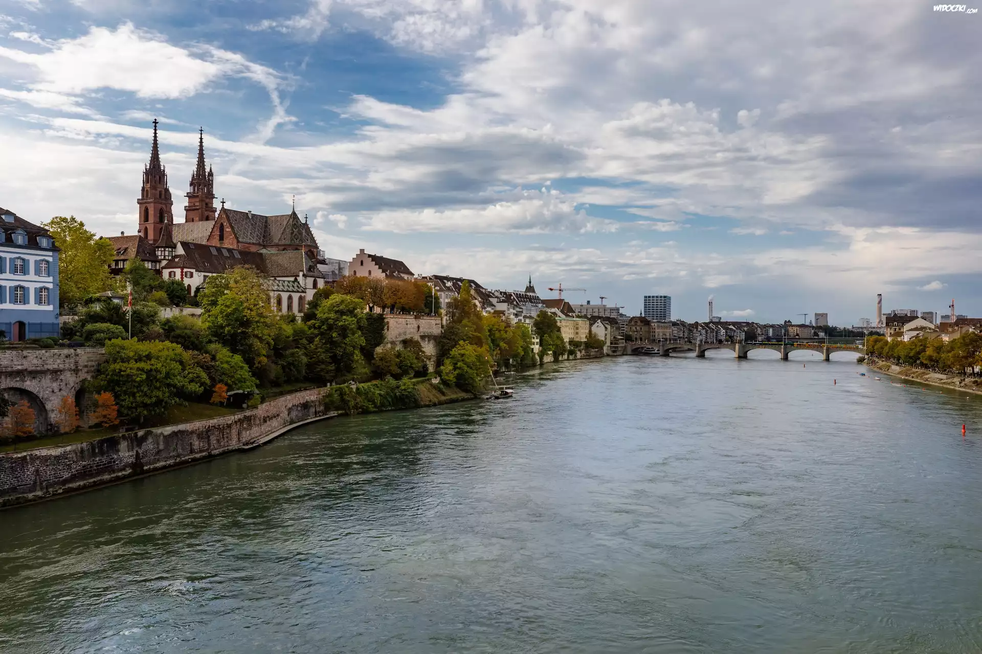Szwajcaria, Bazylea, Rzeka Ren, Domy, Kościół, Most