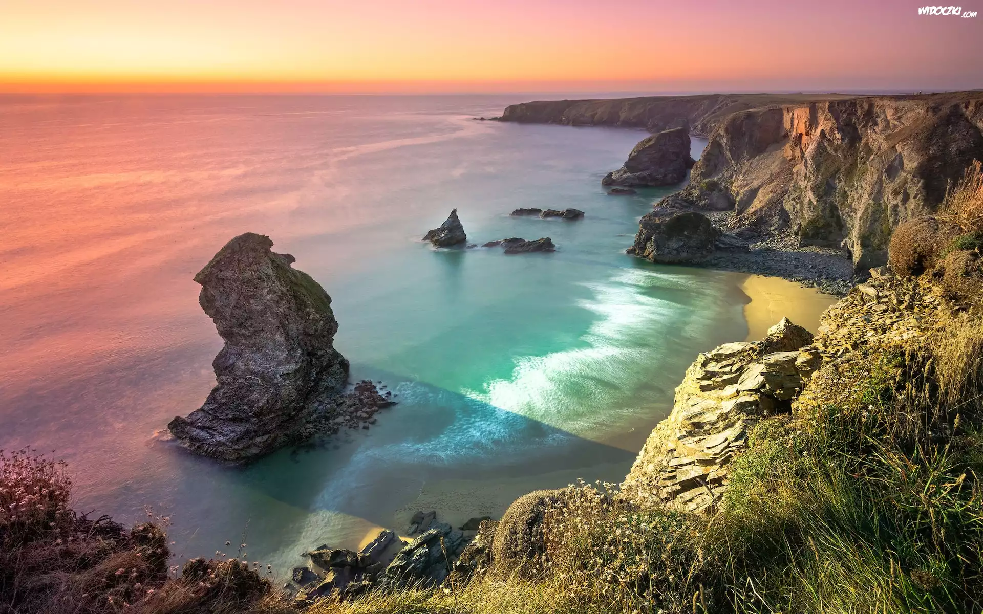 Zdjęcia, Anglia, Kornwalia, Morze Celtyckie, Skały, Wybrzeże, Bedruthan Steps Beach