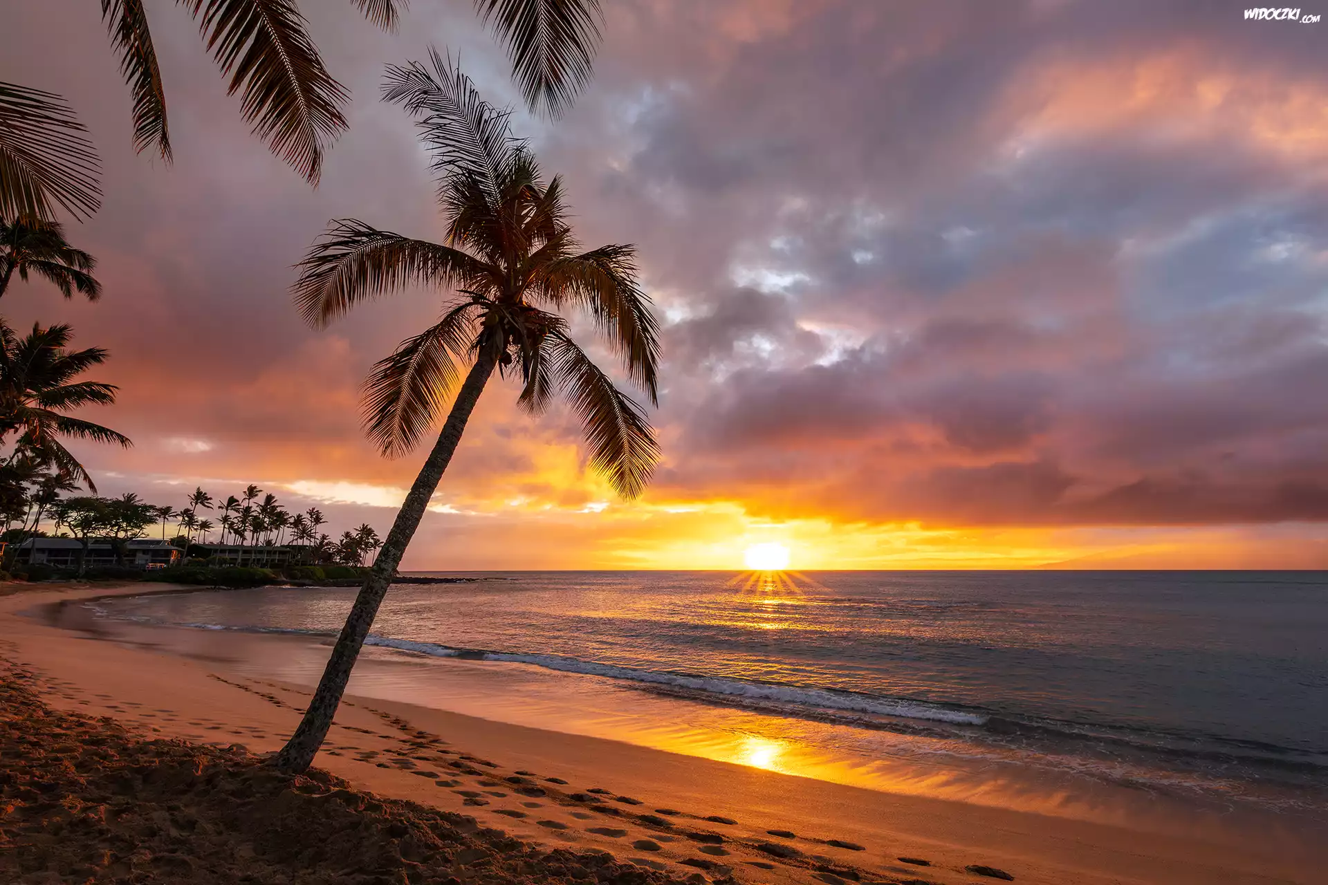 Zachód słońca, Chmury, Morze, Plaża, Napili Beach, Palmy, Wyspa, Maui, Hawaje