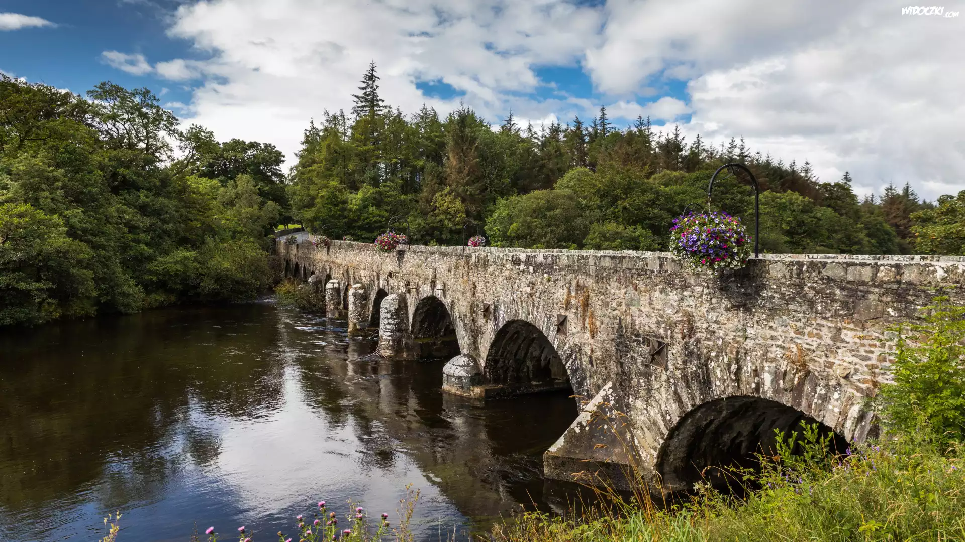 Irlandia, Hrabstwo Kerry, WieÅ› Beaufort, Rzeka Laune, Most kamienny Beaufort Bridge, Rzeka, Las, Drzewa |