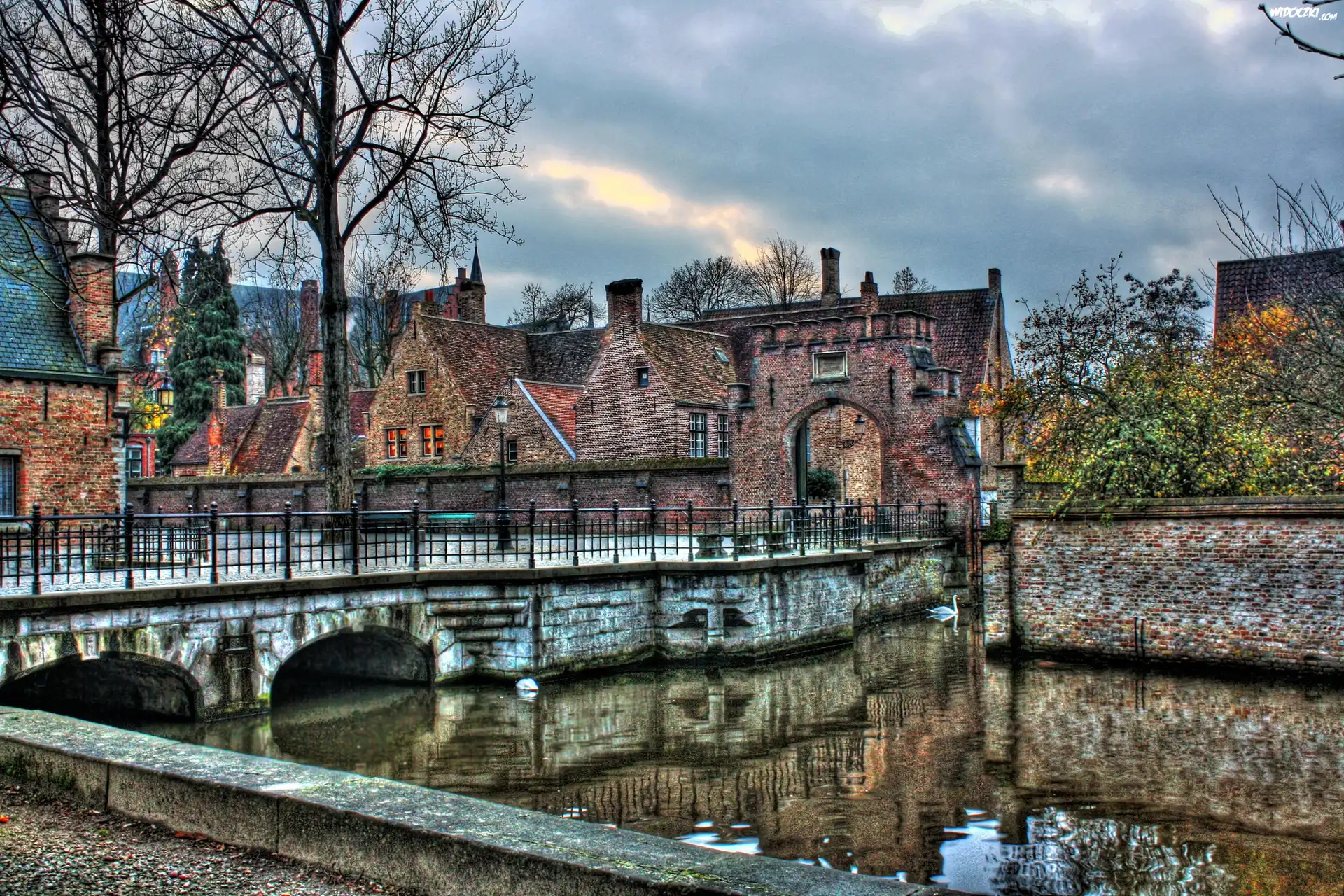 Belgia, Brugia, Domy, Rzeka, Drzewa, Łabędź