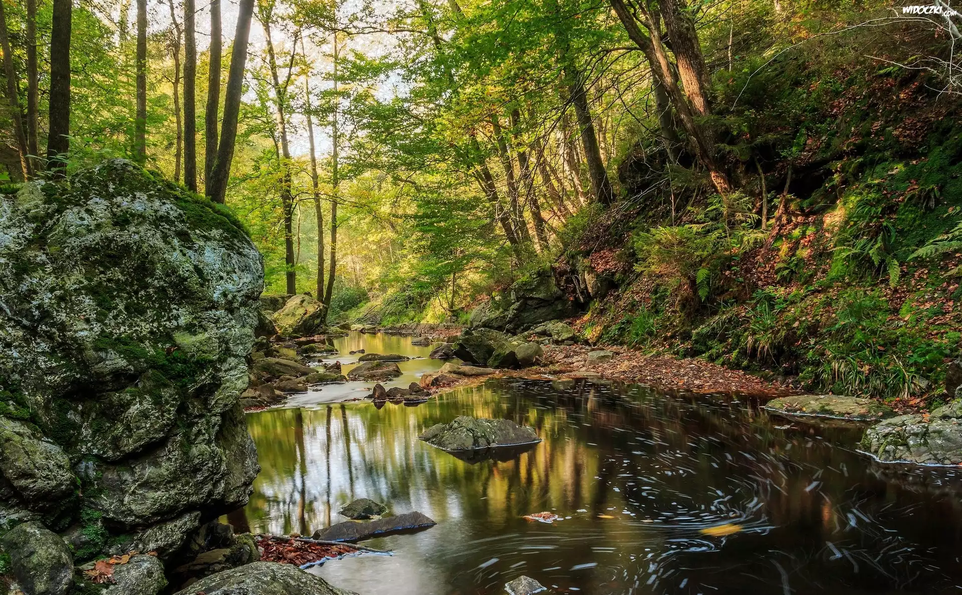 Zdjęcia, Belgia, Ardeny, Las, Rzeka, Kamienie