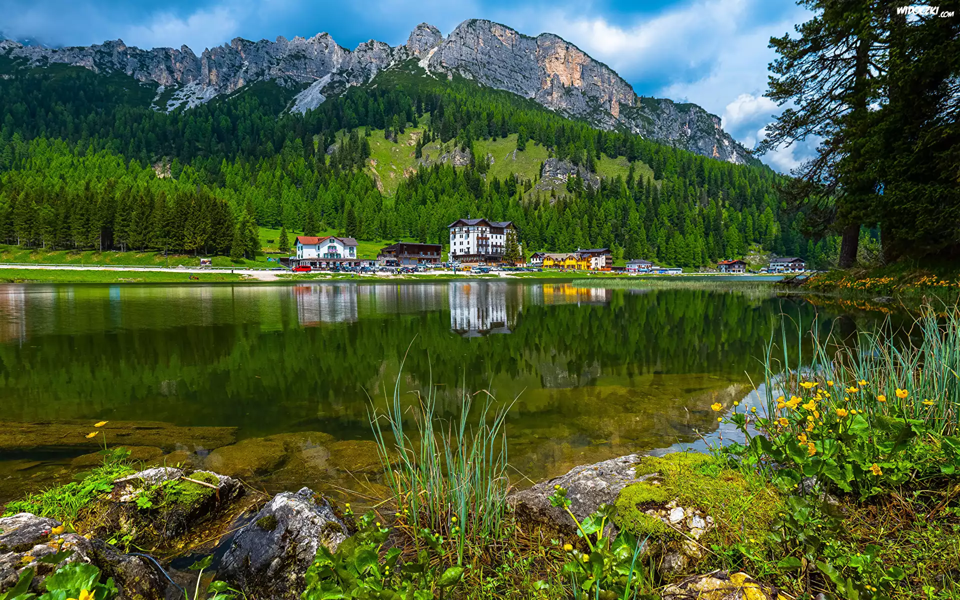 Włochy, Góry, Dolomity, Las, Drzewa, Prowincja, Belluno, Jezioro, Lago di Misurina, Domy, Kwiaty, Kaczeńce, Omszałe, Kamienie |