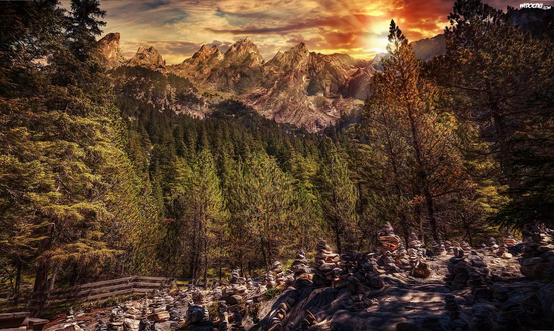 Zdjęcia, Szwajcaria, Kanton Berno, Alpy Berneńskie, Kamienie, Las, Góry, Poranek, Wschód słońca