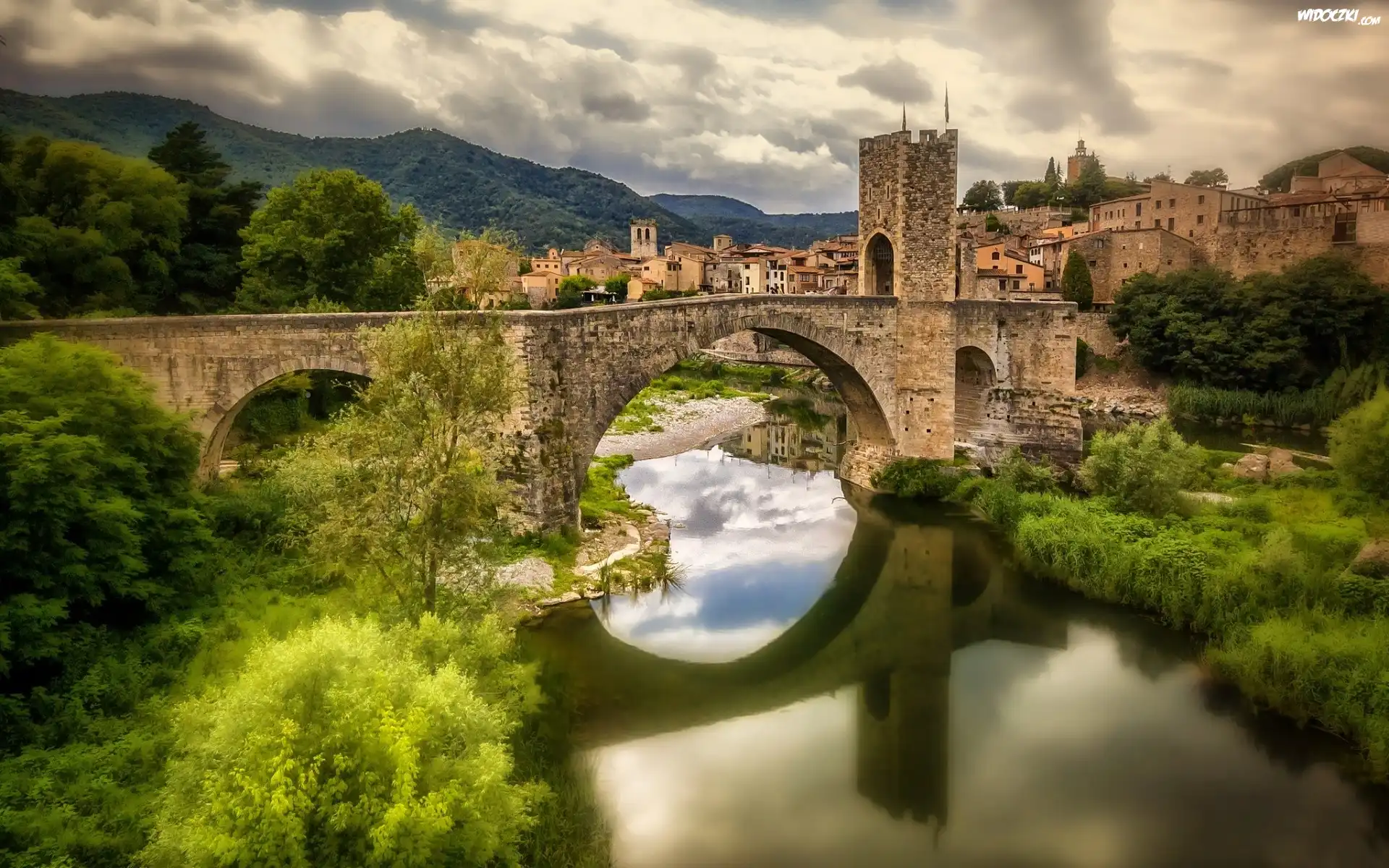 Besalu, Hiszpania, Most, Rzeka, Krzewy