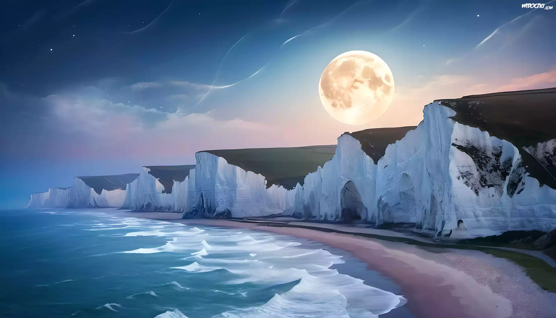 Białe, Klify, Seven Sisters, Księżyc, Morze, Anglia, Wielka Brytania, Grafika