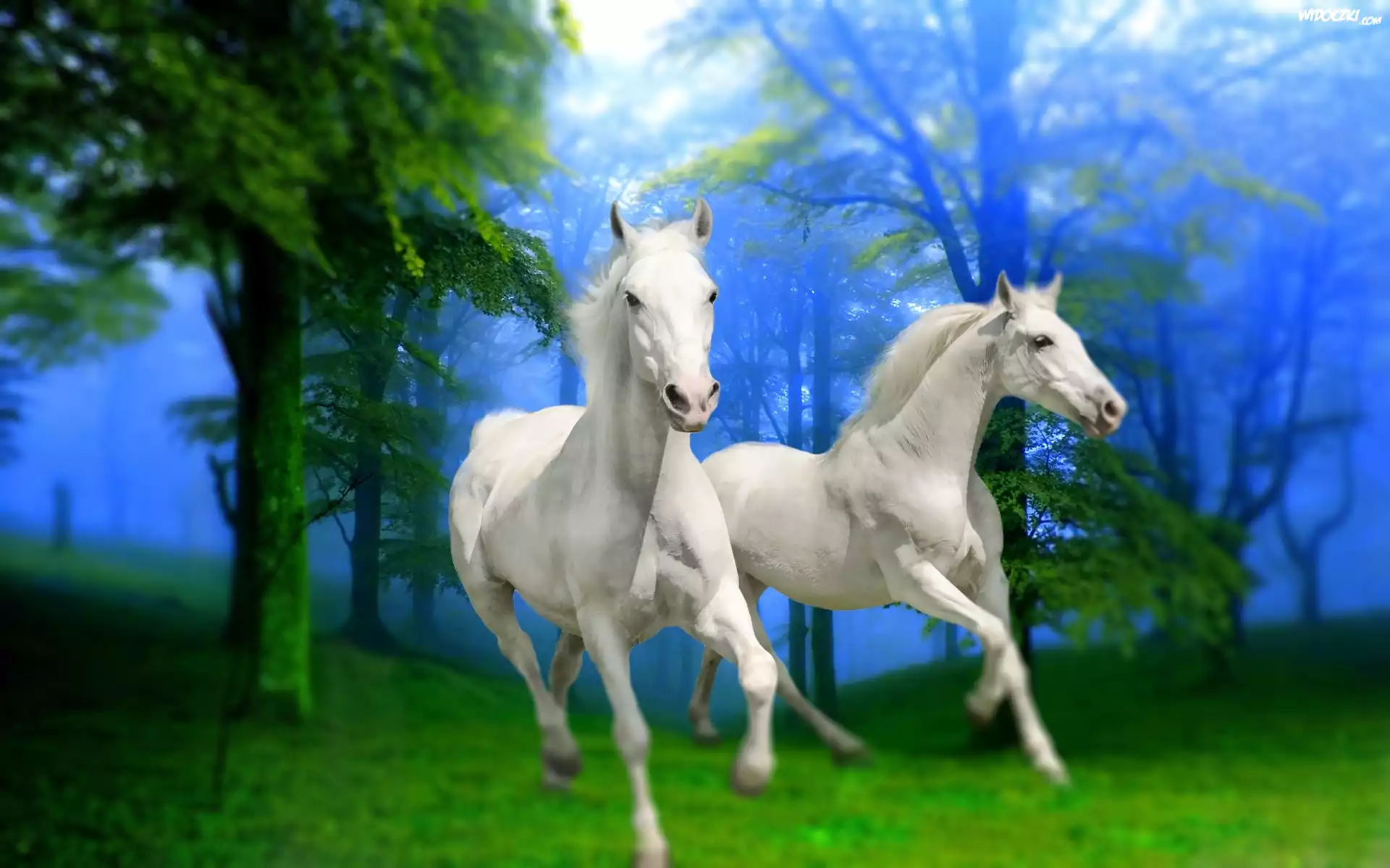 Zdjęcia, Białe, Konie, Las, Drzewa, Mgła