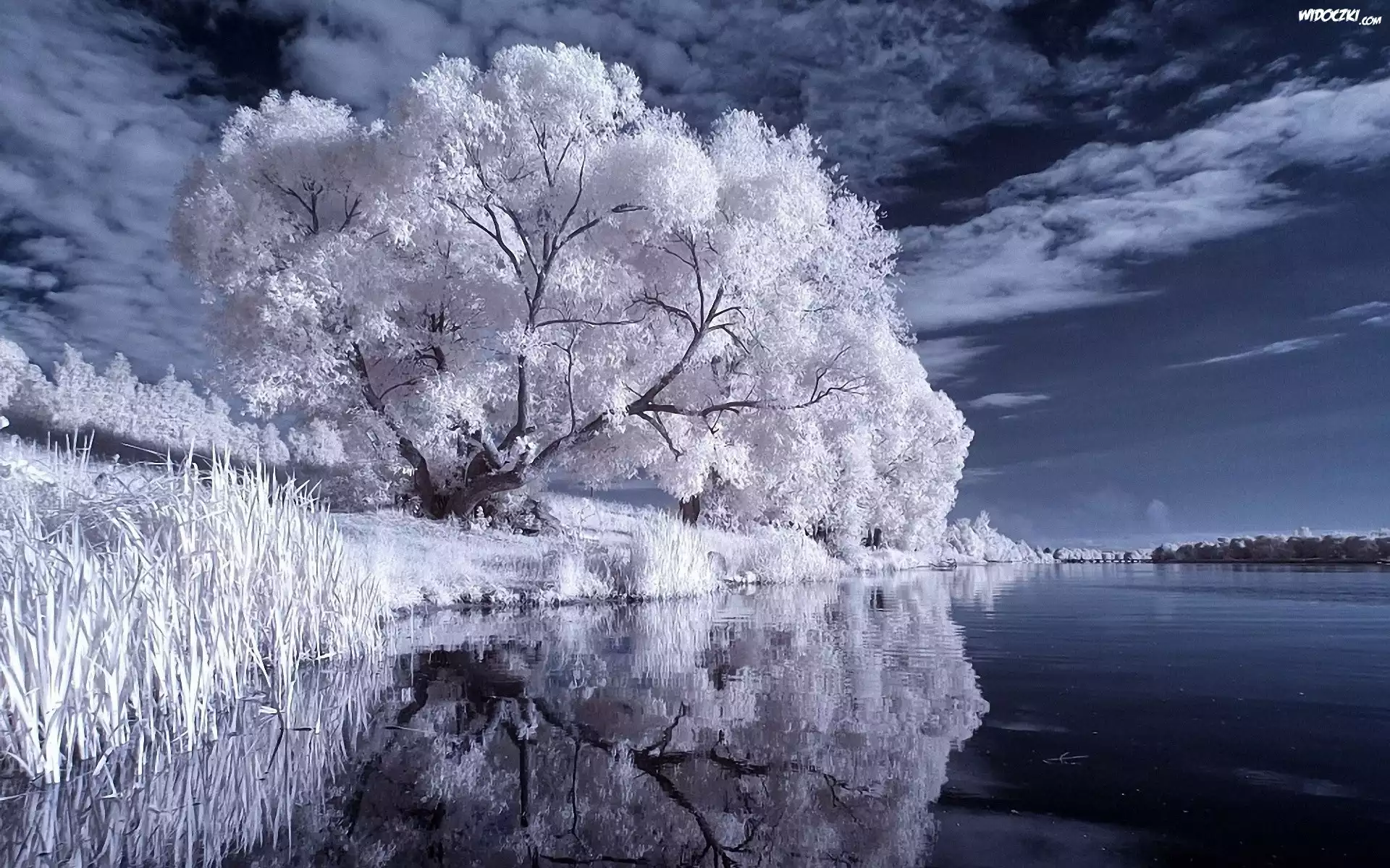 Zdjęcia, Białe, Drzewa, Jezioro, Niebo