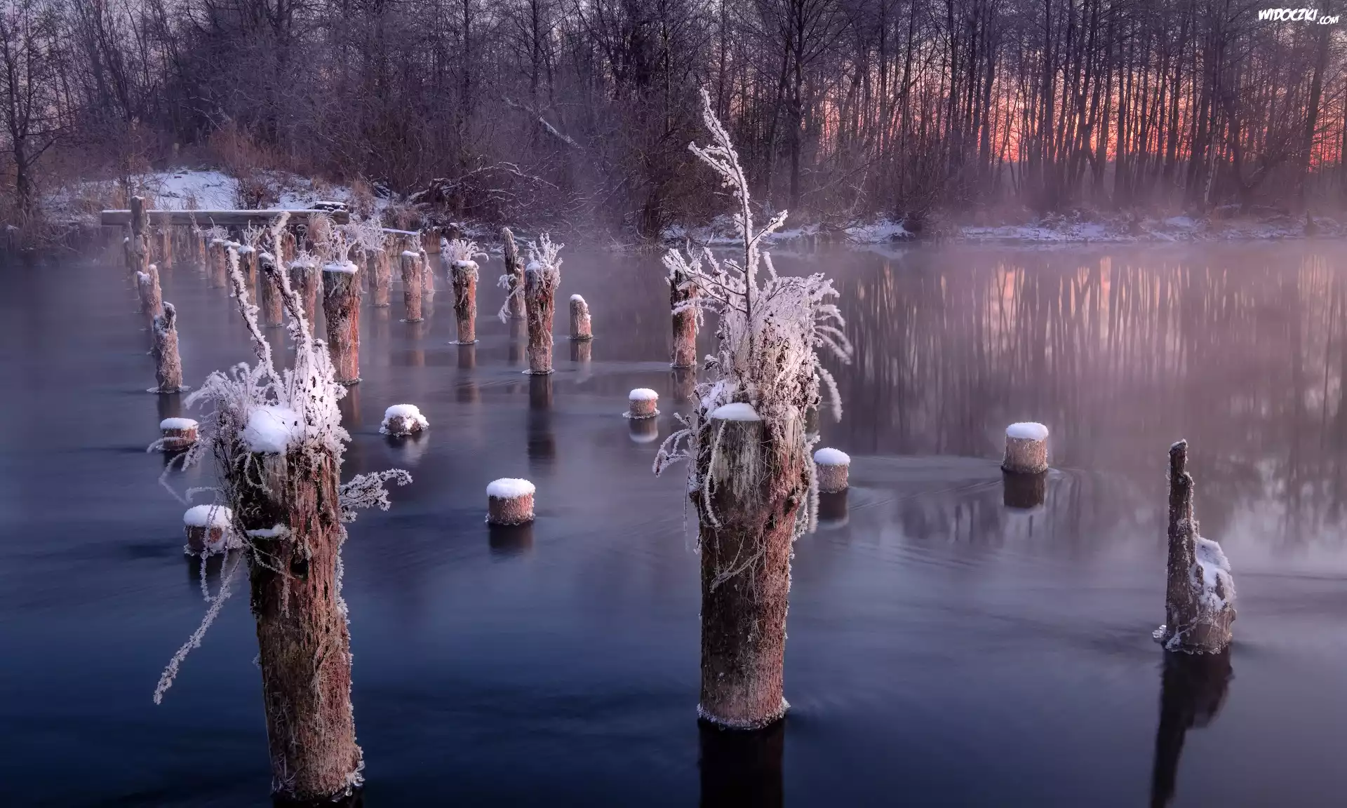 Zdjęcia, Zima, Jezioro Białe, Drzewa, Kołki, Szron, Miejscowość Szatura, Obwód moskiewski, Rosja
