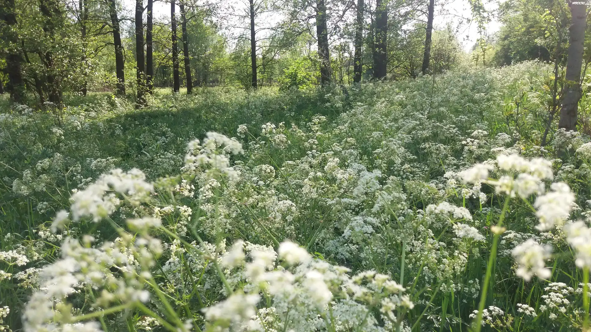 Białe, Kwiaty, Łąka, Las, Drzewa