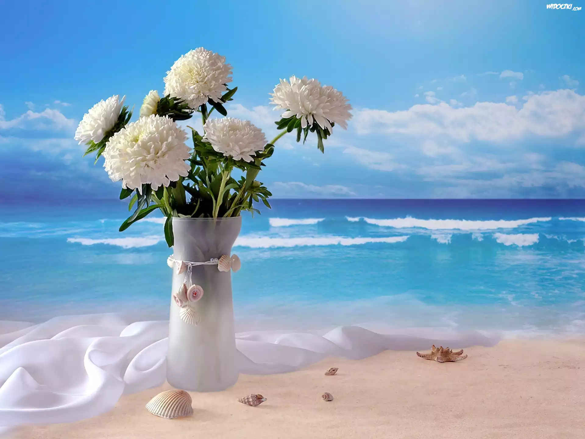 Zdjęcia, Białe, Piwonie, Plaża, Morze, Niebo