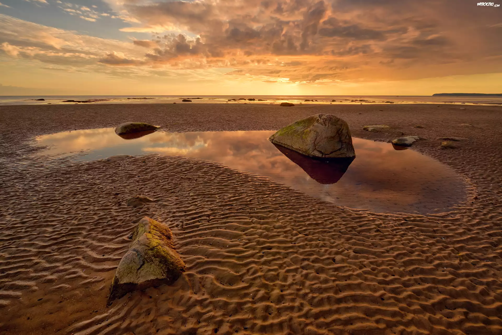 Morze Białe, Plaża, Kamienie, Zachód słońca, Chmury, Rosja