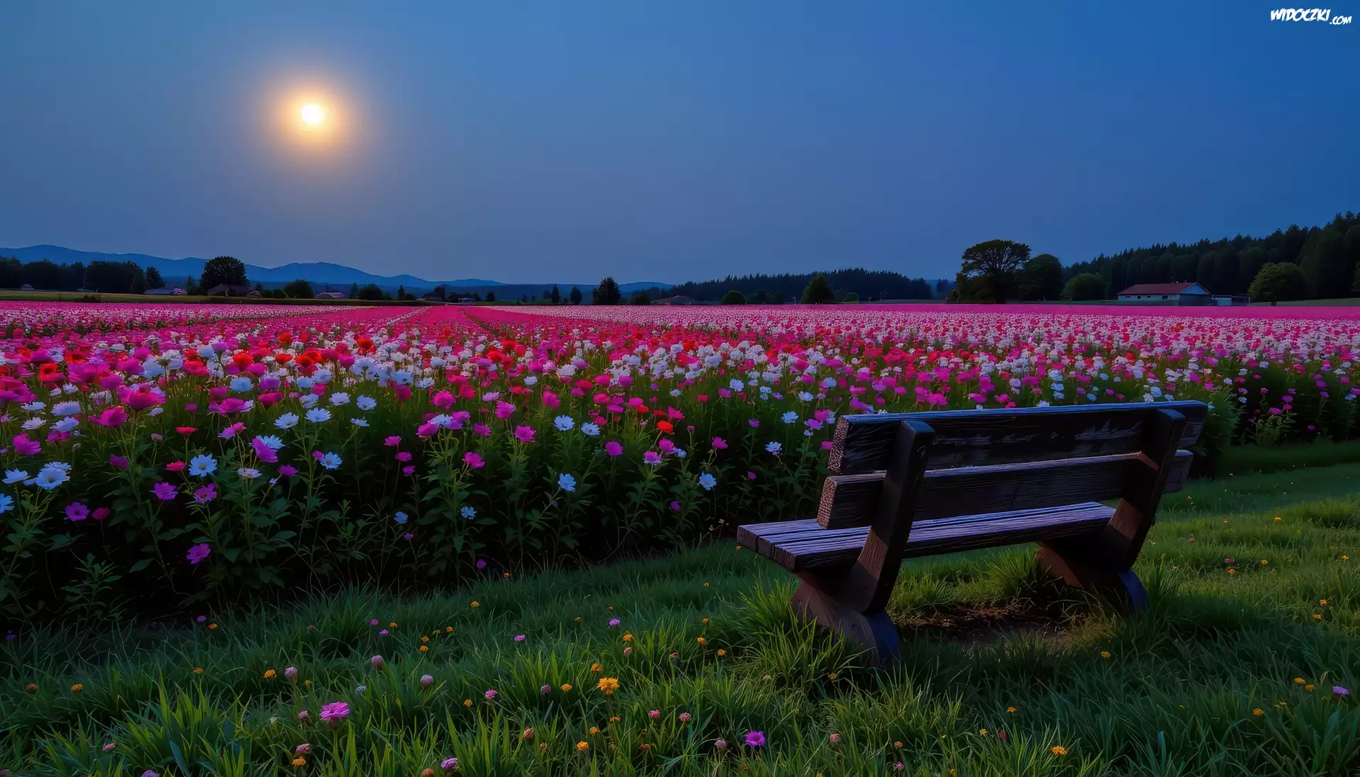 Zdjęcia, Ławka, Białe, Różowe, Kwiaty, Księżyc