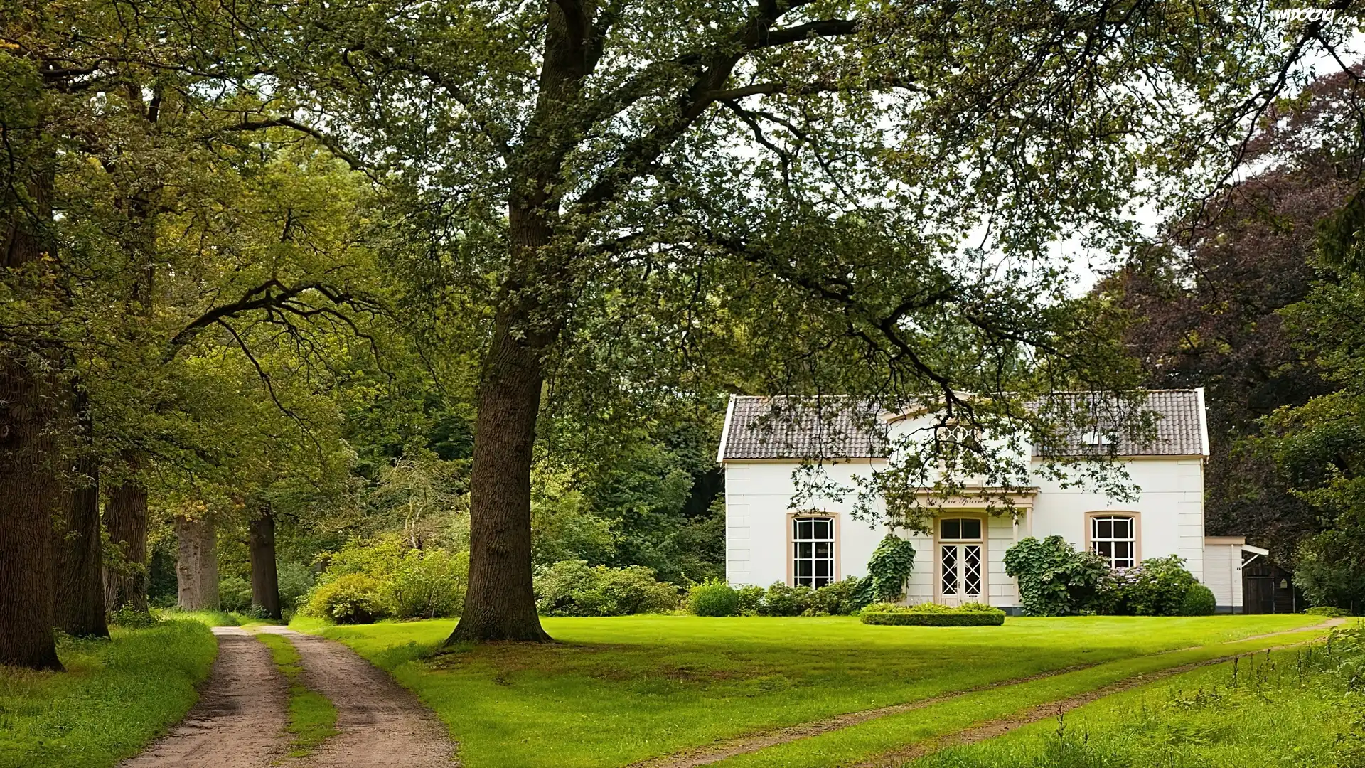 Biały, Domek, Dróżka, Drzewa