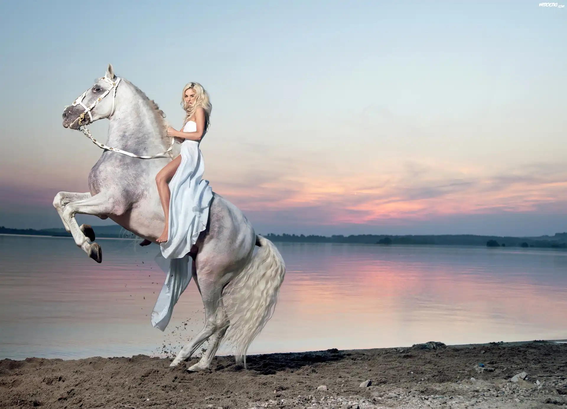 Zdjęcia, Biały, Koń, Kobieta, Jezioro
