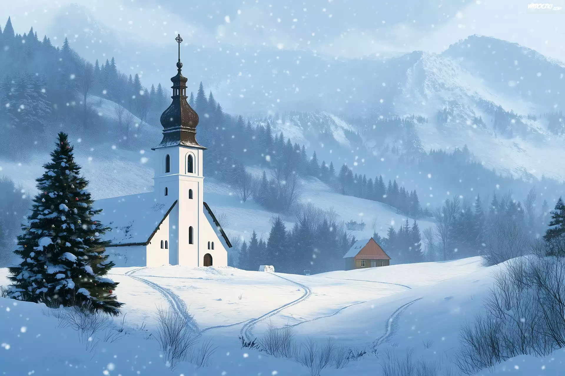 Zdjęcia, Zima, Biały, Kościół, Choinka, Góry