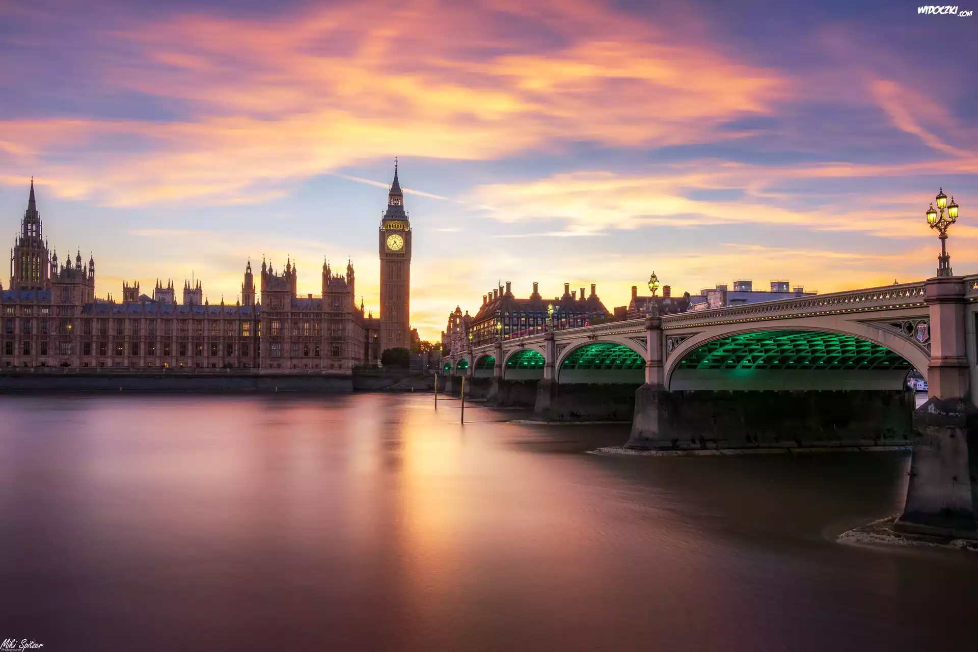 Zachód słońca, Rzeka, Tamiza, Most, Wieża Zegarowa, Big Ben, Pałac Westminsterski, Londyn, Anglia, Wielka Brytania |