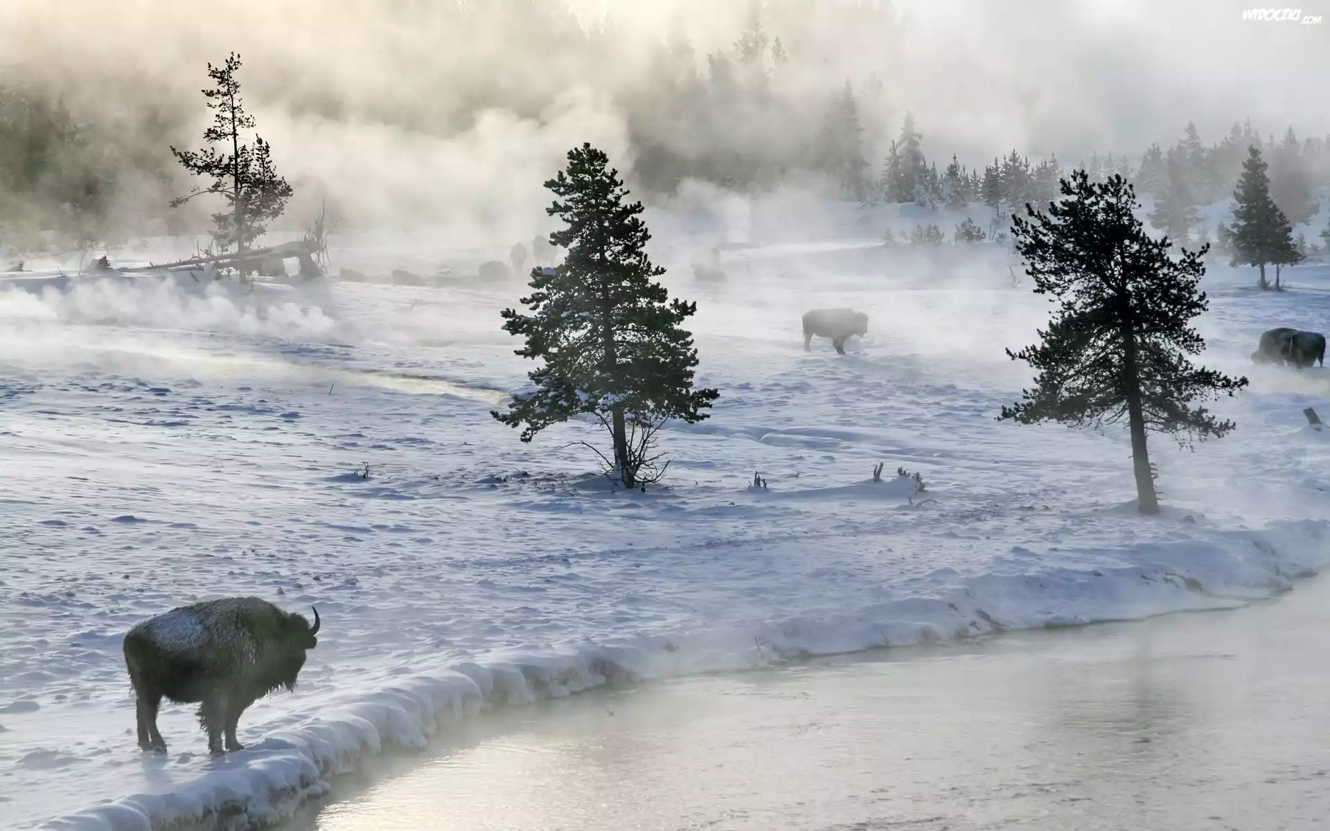 Zdjęcia, Bizony, Rzeka, Drzewa, Śnieg, Mgła
