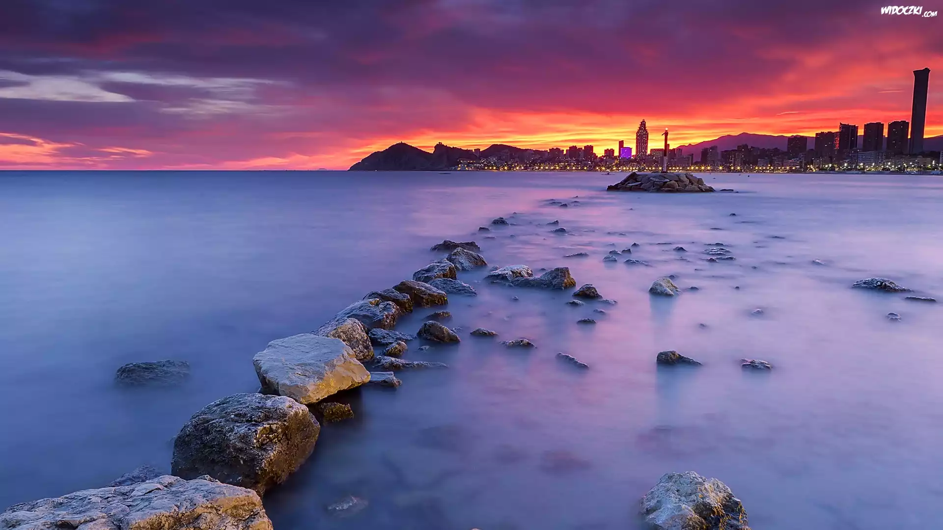 Zdjęcia, Hiszpania, Costa Blanca, Benidorm, Morze, Kamienie, Wieżowce, Światła, Chmury, Zachód słońca