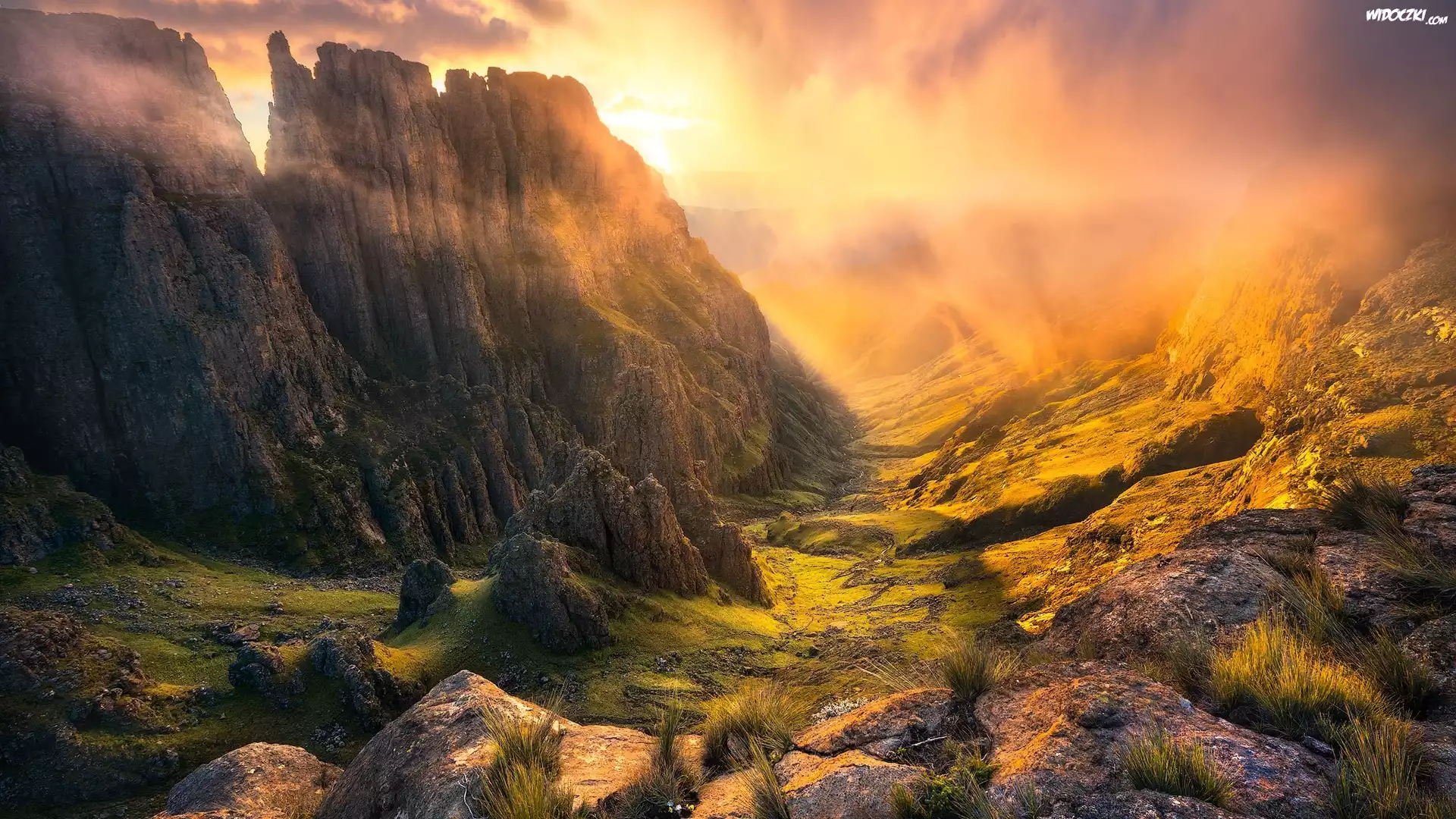 Zdjęcia, Góry, Skały, Dolina, Blask, Słońca, Kępki, Trawy