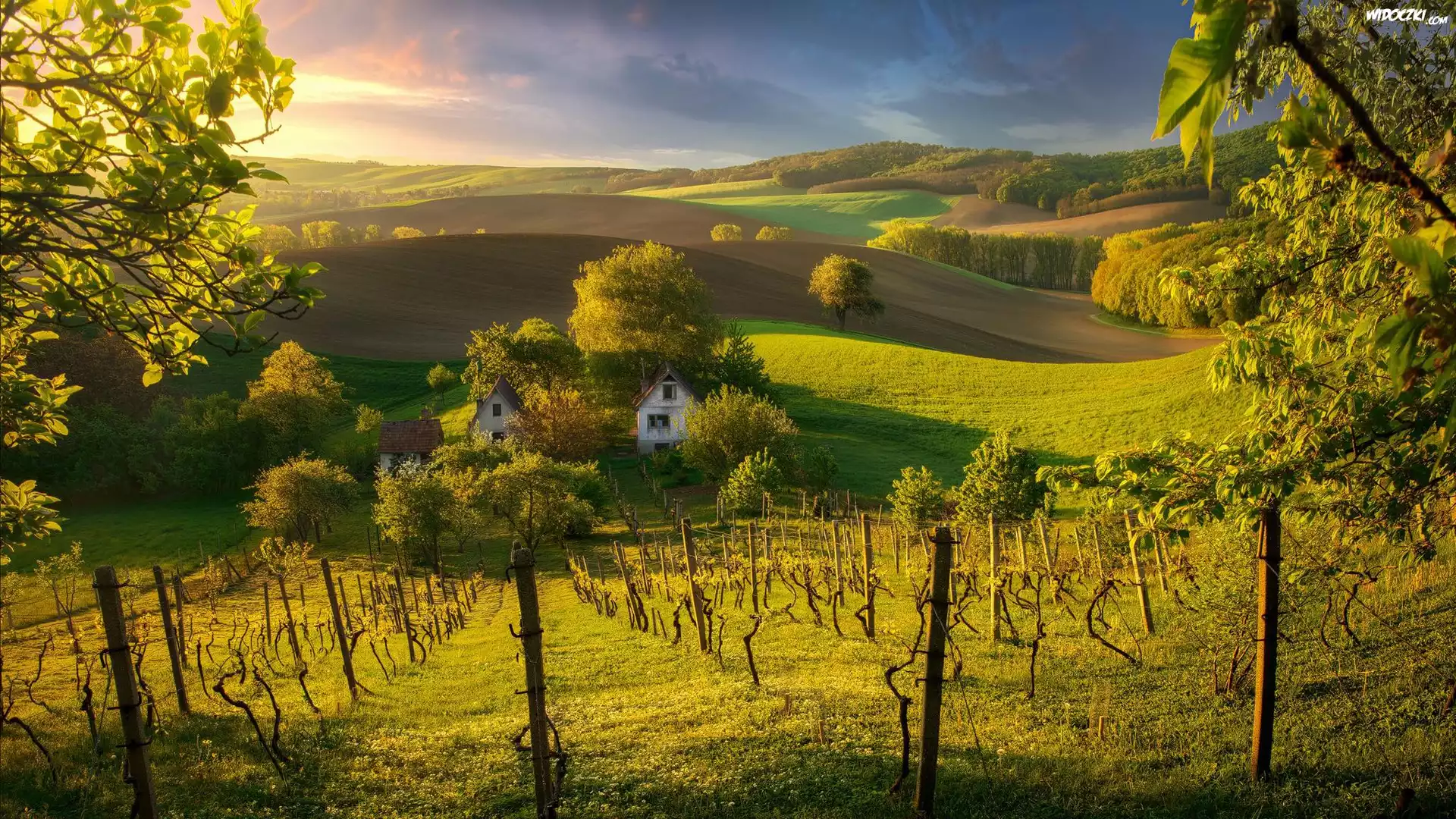 Zdjęcia, Słowacja, Wzgórza, Winnice, Pola, Drzewa, Dom, Słoneczny blask