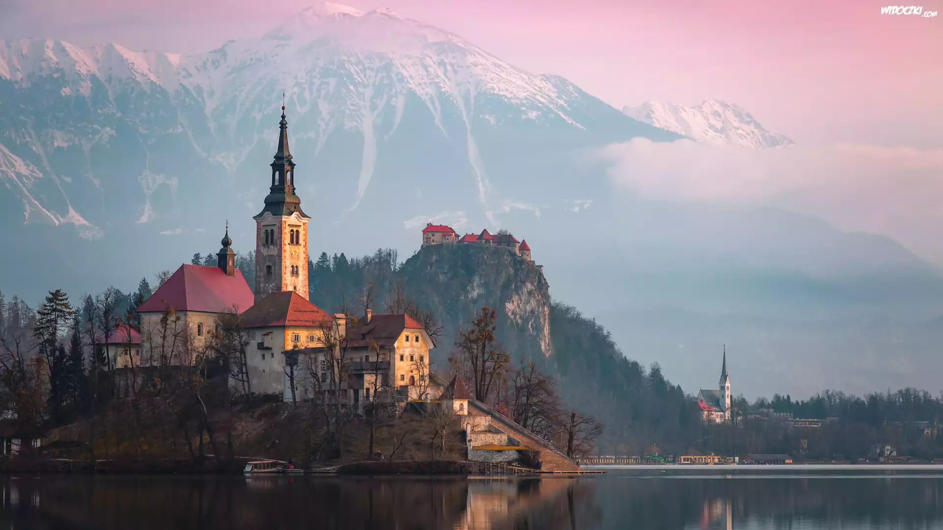 Zdjęcia, Słowenia, Jezioro Bled, Góry Alpy Julijskie, Skały, Kościół Zwiastowania Marii Panny