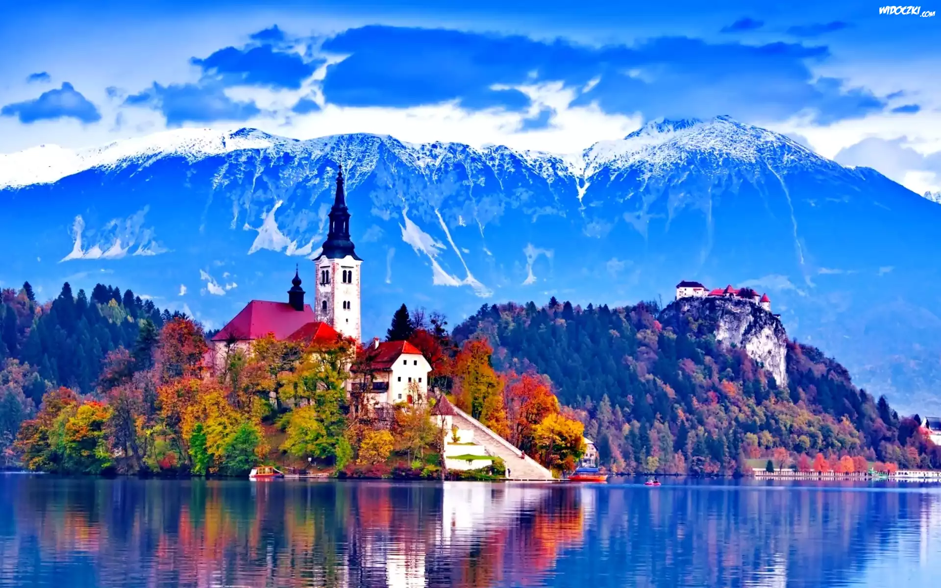 Zdjęcia, Jezioro Bled, Kościół, Góry, Lasy, Jesień, Słowenia