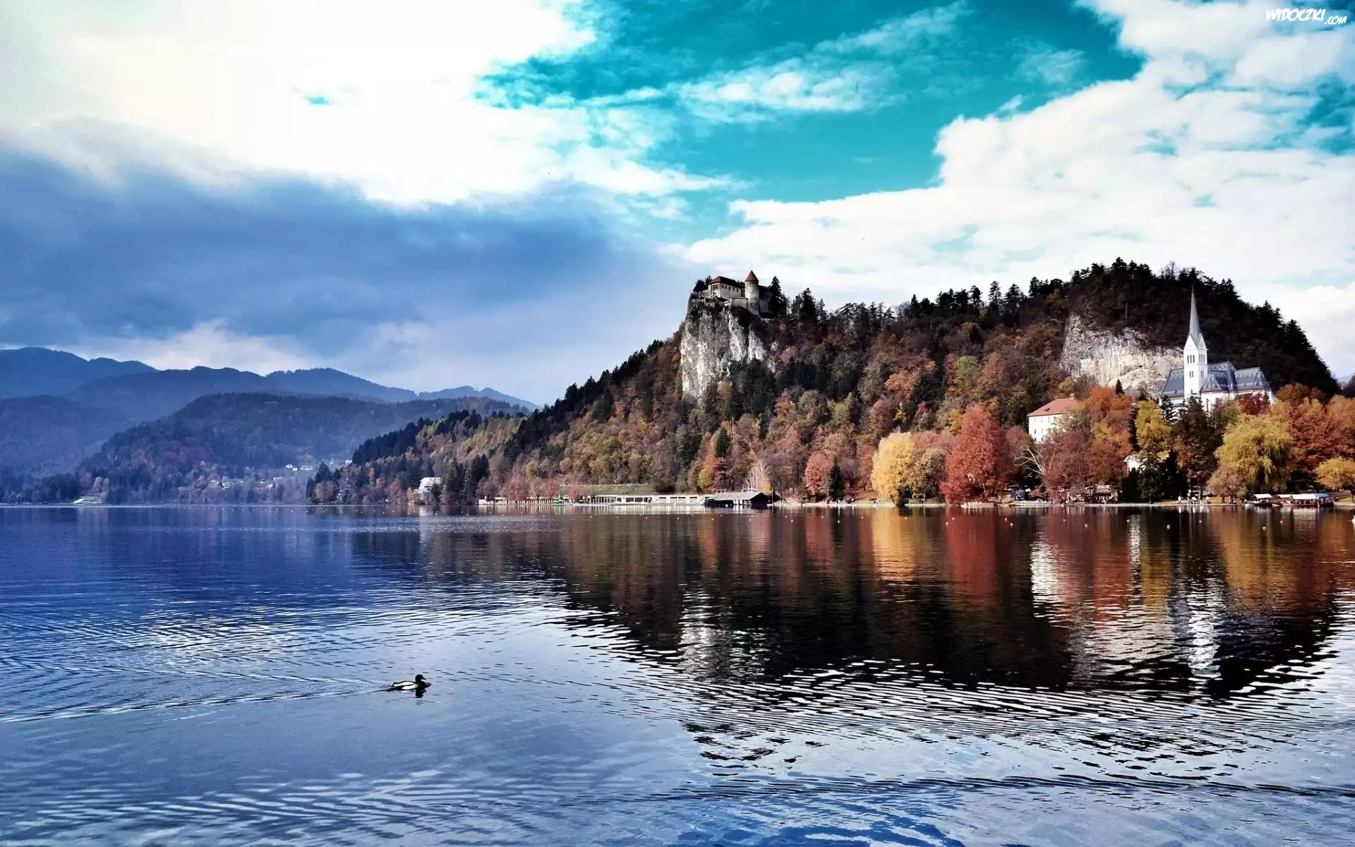 Zdjęcia, Słowenia, Bled, Jezioro Lake Bled, Kościół, Zamek Bled Castle