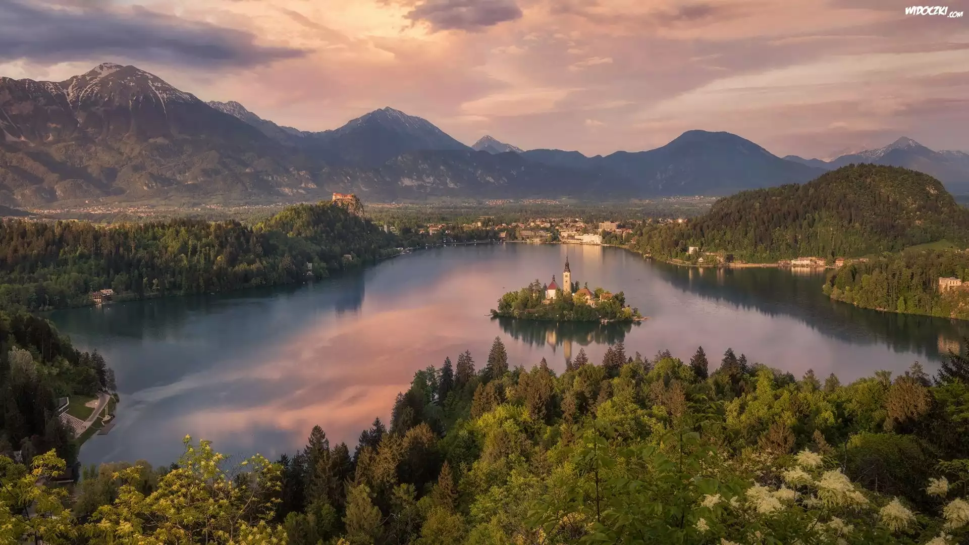 Zdjęcia, Słowenia, Wyspa Blejski Otok, Góry Alpy Julijskie, Jezioro Bled, Chmury, Drzewa