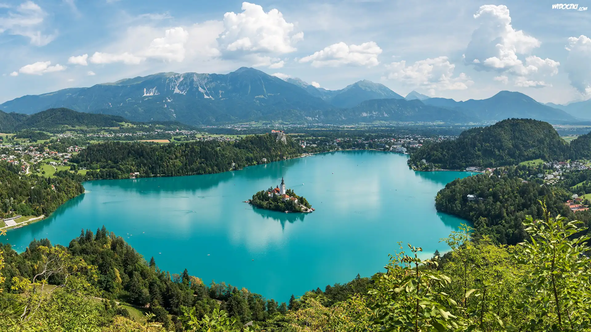 Zdjęcia, Słowenia, Wyspa Blejski Otok, Jezioro Bled, Góry Alpy Julijskie, Drzewa, Roślinność