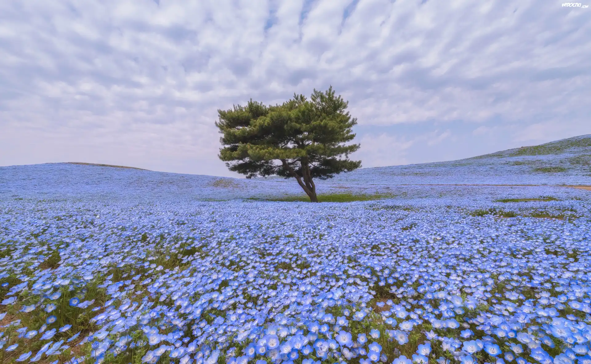 Łąka, Kwiaty, Porcelanka błękitna, Drzewo