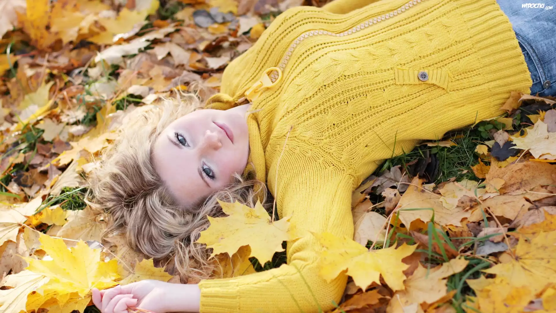 Zdjęcia, Blondynka, Kobieta, Jesień, Liście