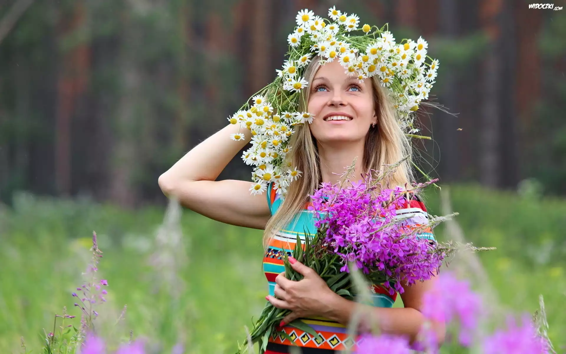 Zdjęcia, Blondynka, Wianek, Bukiecik, Kwiatów, Polana, Las