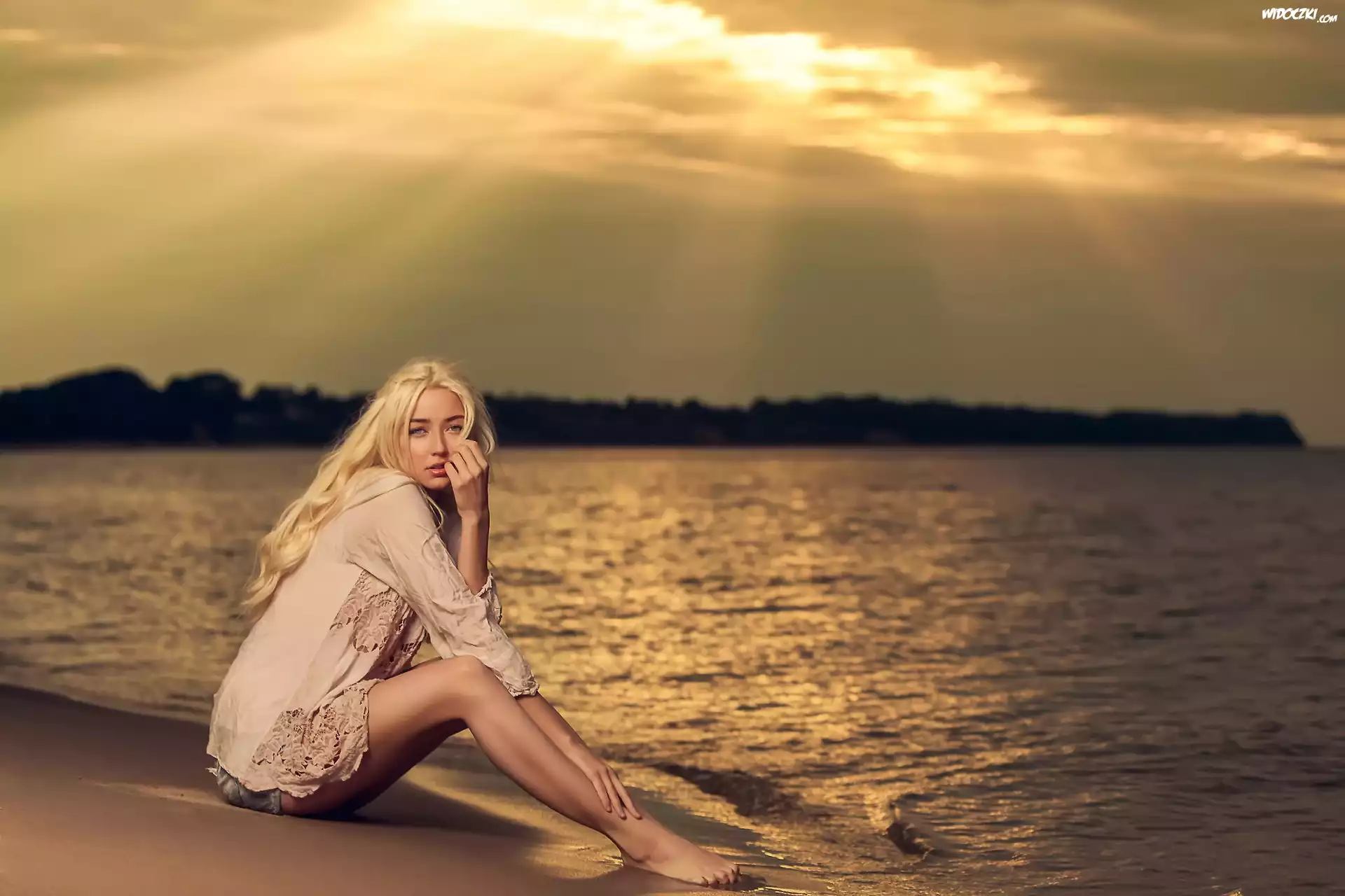 Blondynka, Jezioro, Piasek, Promienie, Słońca